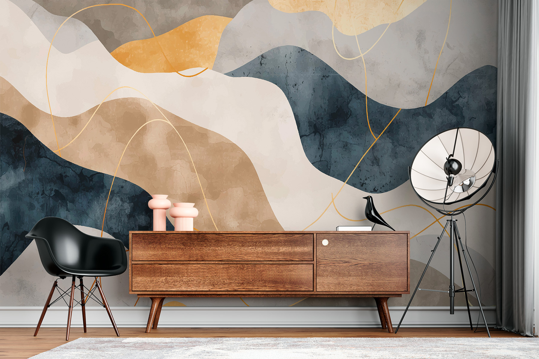 State pensando di abbellire il vostro spazio? Immergetevi in queste eleganti ondate di arte astratta, perfette per infondere un’atmosfera moderna. Una miscela di stile contemporaneo e fascino geometrico, questo murale sussurra raffinatezza, mentre le sue ricche texture invitano a esplorare ogni centimetro. Immaginate di sorseggiare il vostro caffè mattutino, osservando questi motivi vorticosi, quasi come se vi foste persi nel mare. È come una piccola fuga senza uscire di casa. Inoltre, ha il giusto mix di chic e accogliente, che lo rende un delizioso spunto di conversazione!