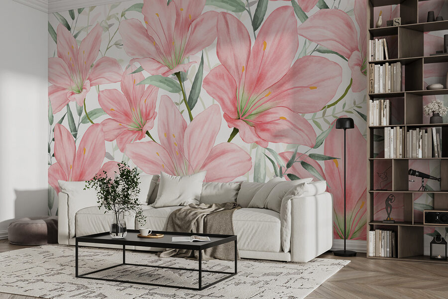 Immaginate di entrare in una stanza in cui ogni parete sussurra un dolce saluto con gigli in fiore, dolcemente rosa ed elegantemente in bilico. Questo murale – chiamiamolo “ruba scena” – porta un po’ di natura all’interno, con un pizzico di fiaba. È come fare una festa in giardino senza preoccuparsi del tempo! Perfetto per chi ama il connubio tra arte e natura, sembra un abbraccio personale di Madre Natura in persona. Gli ospiti potrebbero anche chiedervi dove avete preso quella splendida “opera d’arte”, e voi potrete semplicemente sorridere, annuire con cognizione di causa e lasciare che siano i gigli a parlare.