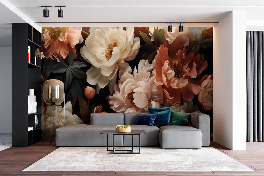 Immaginate di entrare in una stanza ed essere accolti dall’elegante danza dei fiori su uno sfondo ricco e scuro. Questo murale porta in casa l’incanto di un giardino di mezzanotte, dove peonie e altri fiori ondeggiano sottilmente, come se fossero catturati da una leggera brezza. È un sussurro del dramma della natura, perfetto per creare un angolo accogliente o per trasformare una parete spenta in un pezzo forte. I contrasti profondi danno una sensazione di comfort e di intrigo, come se si scoprisse un giardino segreto al crepuscolo, suscitando un senso di avventura e di pace allo stesso tempo.