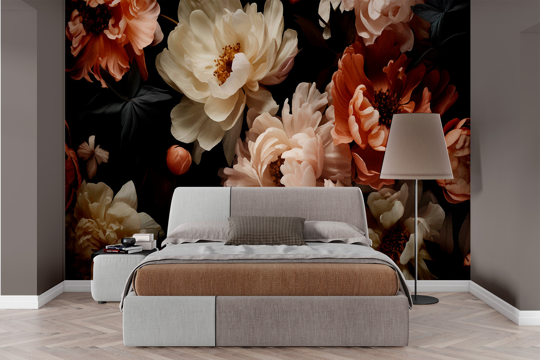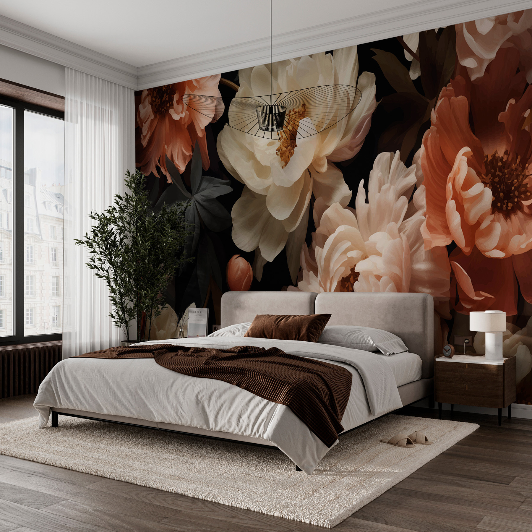 Immaginate di entrare in una stanza ed essere accolti dall’elegante danza dei fiori su uno sfondo ricco e scuro. Questo murale porta in casa l’incanto di un giardino di mezzanotte, dove peonie e altri fiori ondeggiano sottilmente, come se fossero catturati da una leggera brezza. È un sussurro del dramma della natura, perfetto per creare un angolo accogliente o per trasformare una parete spenta in un pezzo forte. I contrasti profondi danno una sensazione di comfort e di intrigo, come se si scoprisse un giardino segreto al crepuscolo, suscitando un senso di avventura e di pace allo stesso tempo.