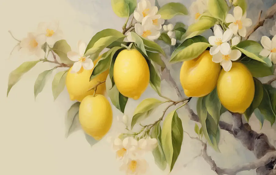 Ravvivate uno spazio con un tocco di allegria agrumata. Questo murale, che raffigura limoni appesi a rami verdeggianti, porta un tocco di natura all’interno, perfetto per una cucina accogliente o una zona pranzo soleggiata. Immaginate di sorseggiare un tè freddo crogiolandovi nella calda luce di queste bellezze gialle. Non sono solo frutta: evocano pigre giornate estive, il profumo di limonata fresca e picnic soleggiati. Con i delicati fiori che fanno capolino, è come un’eterna primavera. Inoltre, è un argomento di conversazione molto più divertente di un’altra parete insipida. Quindi, perché non lasciare che le vostre pareti assaggino il sapore della vita?
