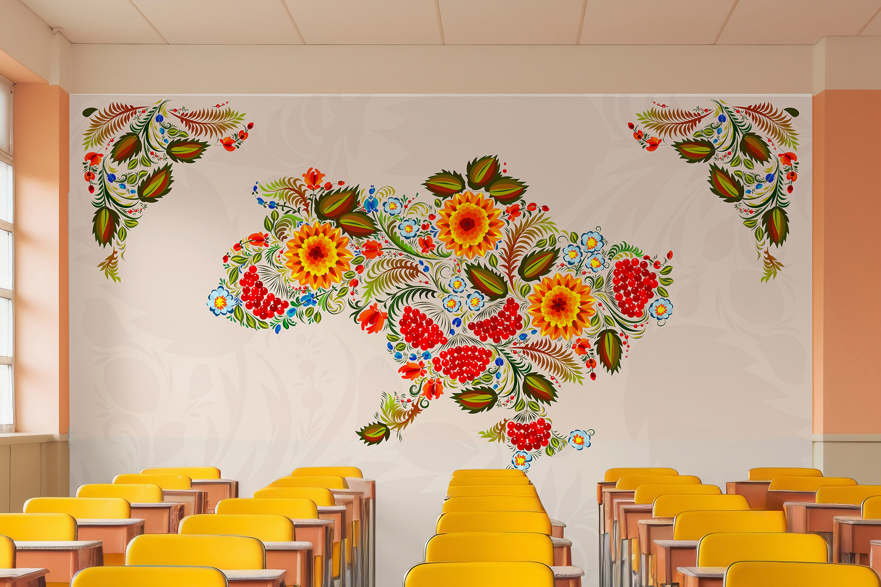 Ehilà, appassionati di arredamento! Vi presentiamo questo splendido murales: è una mappa dell’Ucraina, ma abbandonate le linee noiose per dei fiori sbocciati e vivaci. Immaginate la vostra stanza con un’esplosione di colori, come se un giardino fosse appena entrato. Quei ricchi gialli e rossi, mescolati a verdi vibranti: pura gioia! È come avere un’opera d’arte che sussurra storie di tradizione e cultura. Insomma, chi non vorrebbe iniziare la giornata con la sensazione di entrare in una celebrazione? Perfetto per chi desidera un po’ più di bellezza e carattere nel proprio spazio.