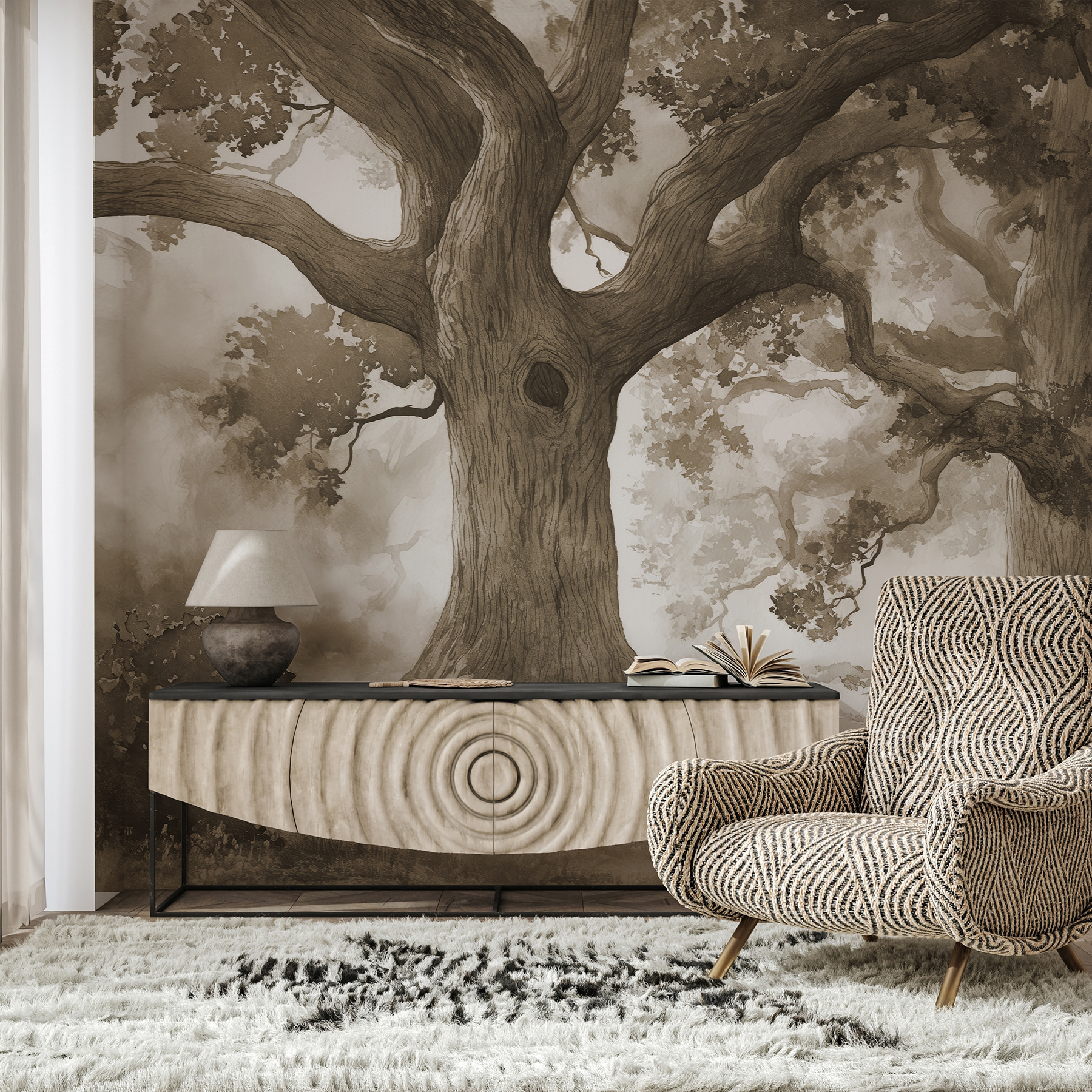 Entrate in un mondo stravagante con questo murale che raffigura un magnifico gruppo di alberi, con un accogliente buco in un tronco, perfetto per sognare ad occhi aperti le creature del bosco che si riposano. Questo disegno porta la serena magia della natura direttamente in casa vostra, lasciando che le pareti sussurrino storie di antiche foreste e tranquille avventure. Immaginate di raggomitolarvi in una giornata di pioggia, con una bevanda calda in mano, mentre gli alberi fanno da guardia, creando uno sfondo confortante. È come avere una fetta di pace all’aria aperta, senza fango. Perfetto per qualsiasi stanza che abbia bisogno di un tocco di tranquillità.