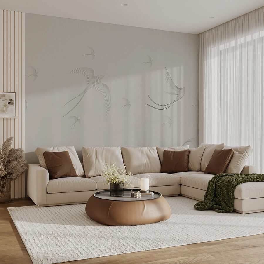 Questo murale non è solo bello, ma aggiunge un tocco di stile contemporaneo perfetto per qualsiasi spazio moderno. Inoltre, è versatile: si adatta perfettamente sia all’ufficio di casa che alla camera da letto. Le linee morbide e i toni delicati fanno sembrare gli uccelli quasi vivi, che fluttuano dentro e fuori con un senso di libertà contagioso.