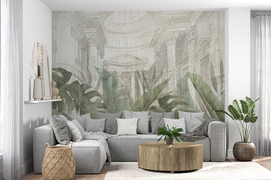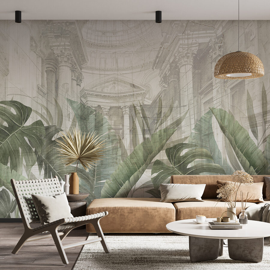 Trasformate il vostro spazio in un’oasi da sogno con questo murale che raffigura una lussureggiante foglia di grandi dimensioni su uno sfondo incantevole. Immaginate di entrare in una stanza e di sentirvi immediatamente sollevati, come se foste entrati in un giardino sereno. Il delicato gioco di verde e architettura morbida invita a un’atmosfera rilassante, perfetta per rilassarsi con un buon libro o per ospitare gli amici.