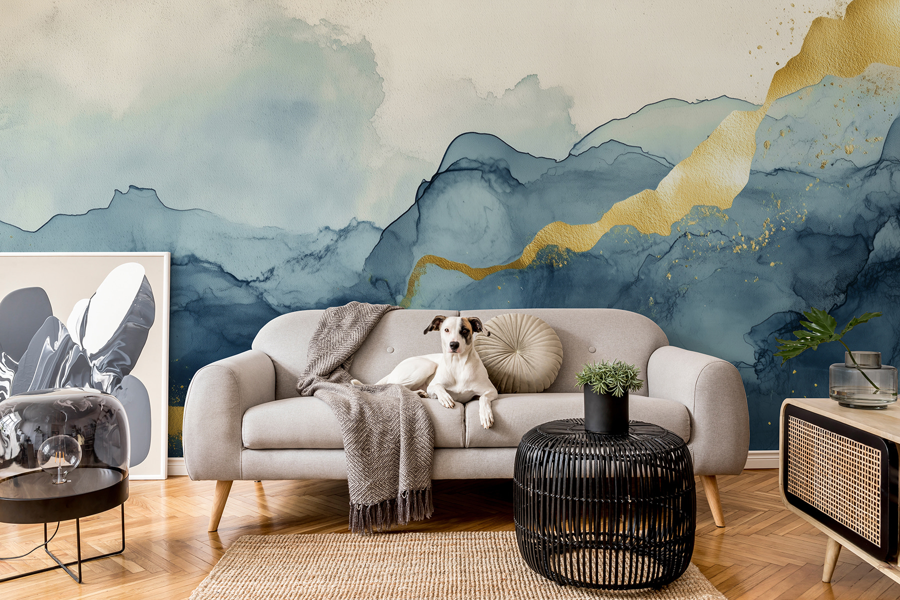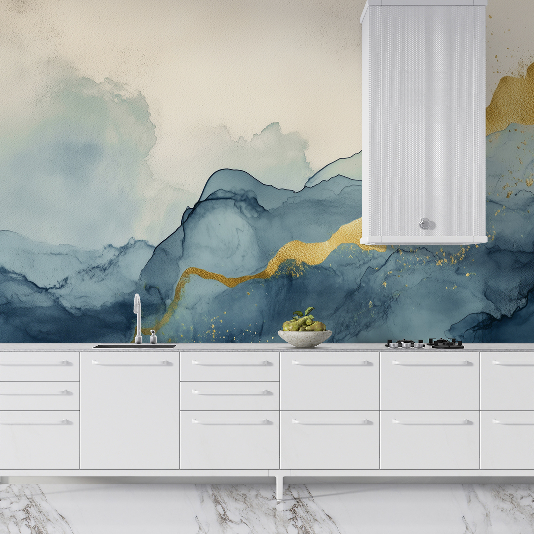 Trasformate il vostro spazio con un tocco di meraviglia! Il murale “Misty Mountains with Shimmering Veins” è come un dolce sussurro della natura, che invita a fuggire in un mondo da sogno. Immaginate di entrare in una stanza e di essere accolti da un blu morbido e fluente e da tenui tonalità terrose. È quasi come essere avvolti da un’accogliente coperta di serenità. Perfetto per quei momenti in cui una parete ha bisogno di un po’ di brio in più.