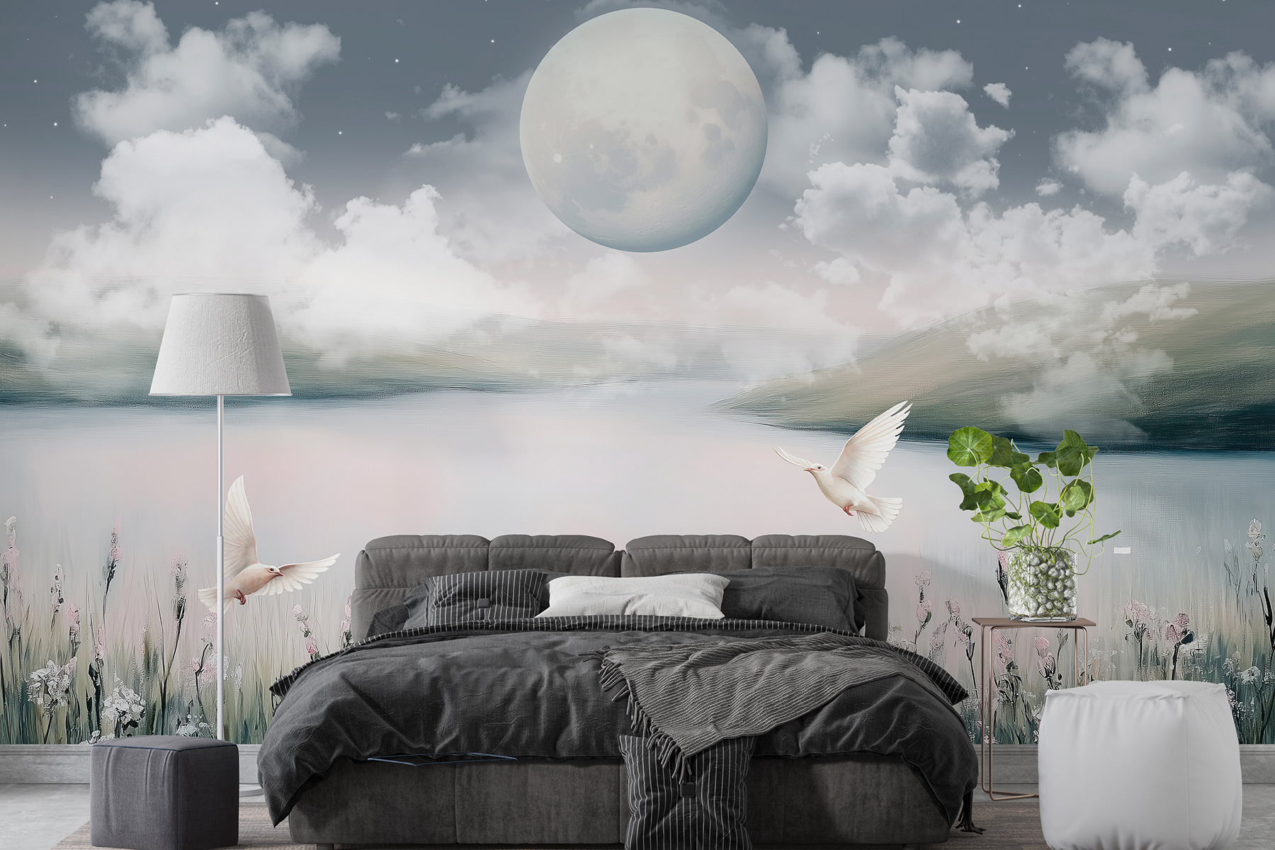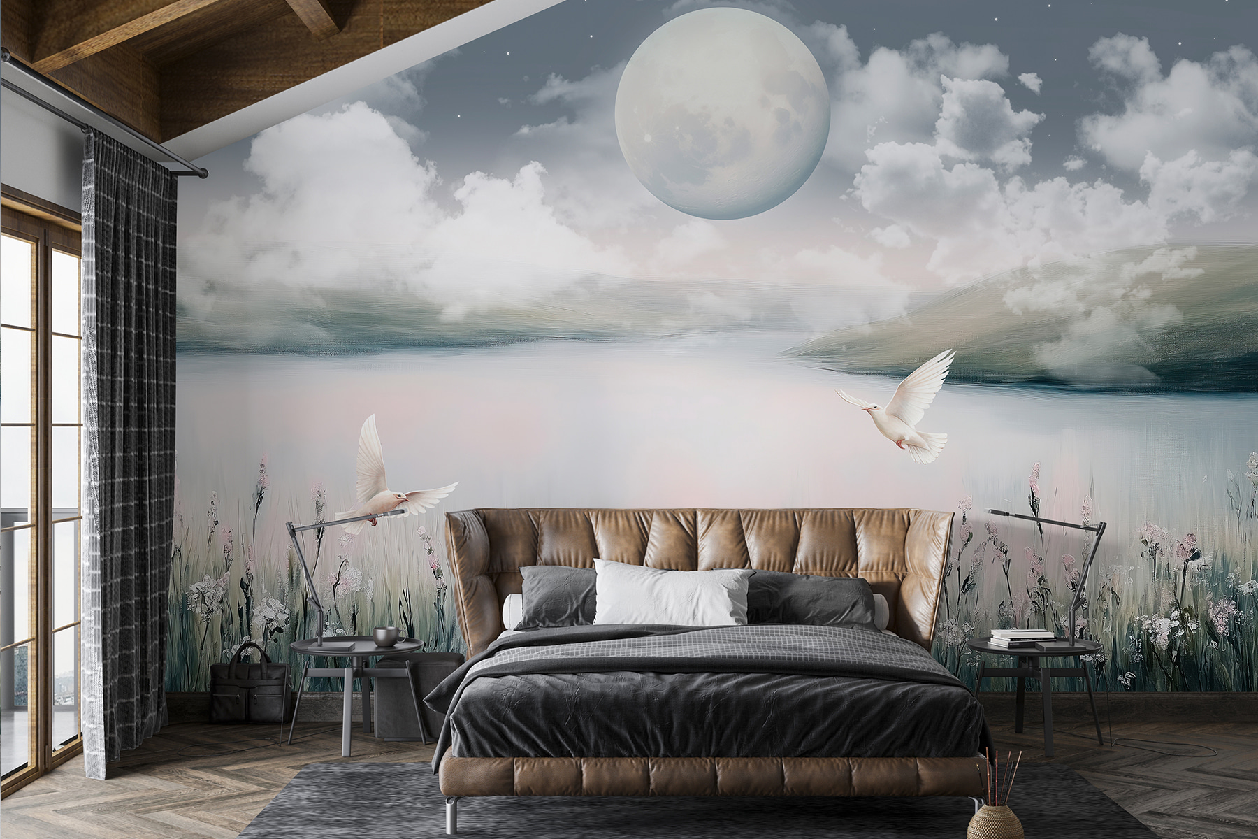 Avete mai desiderato portare un senso di calma e meraviglia nella vostra casa? Questo “Murales w01389” potrebbe fare al caso vostro. Immaginate una scena da sogno ad acquerello in cui la luna si posa dolcemente sopra un lago nebbioso, circondata da soffici nuvole. È come entrare in una favola ogni volta che si entra nella stanza.