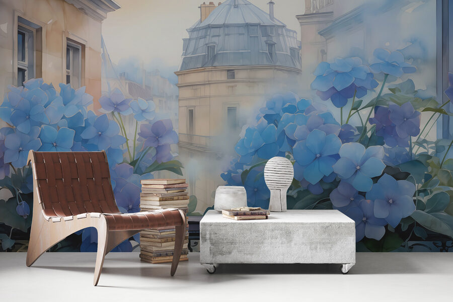 Immaginatevi una pigra domenica mattina, con la luce del sole che filtra dalle finestre, e bum, ecco questo murale! “Murales w01439” è un mix ideale di architettura e natura, che regala al vostro spazio un’accogliente vista dalla finestra che è difficile da battere. Un’esplosione di ortensie blu a cascata su un affascinante balcone con un paesaggio urbano sullo sfondo… è come un biglietto istantaneo per la calma.