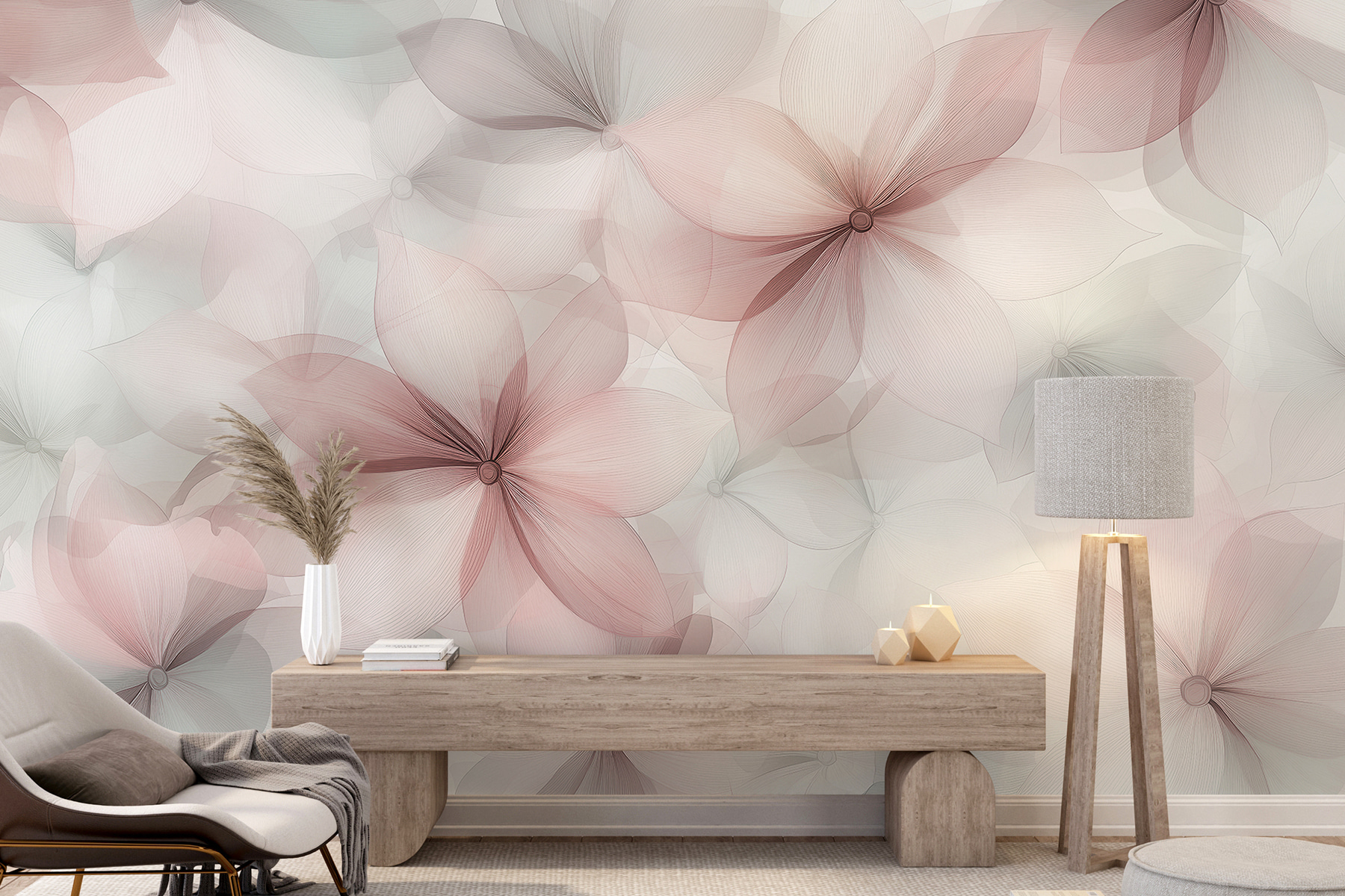 Guardate esattamente come apparirà il vostro spazio con la nuova carta da parati prima di acquistarla. Visualizzazione professionale da parte di designer esperti senza alcun costo o obbligo di acquisto.