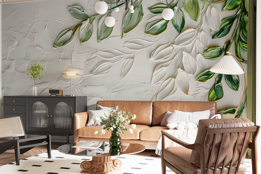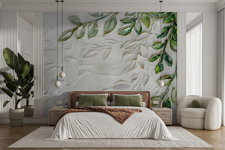 Ehi, guardate questo affascinante murale (w01470)! È come entrare in un giardino sereno ogni volta che si entra nella stanza. Il murale presenta delicate foglie verdi con un effetto 3D così bello che sembra quasi di poterle toccare. Perfetto per chi ama le decorazioni ispirate alla natura con un tocco di classe.
