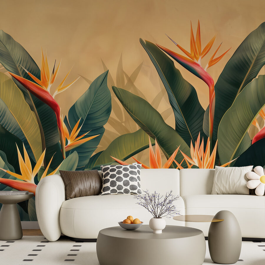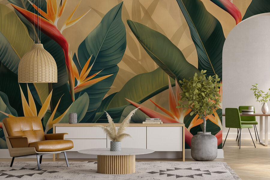 Trasformate qualsiasi stanza in un paradiso tropicale con questo splendido murale con le vivaci piante di Bird of Paradise. I ricchi verdi e gli arancioni infuocati creano uno sfondo vivace, risollevando immediatamente l’umore. Immaginate di entrare nel vostro salotto e di sentirvi come in una fuga tropicale al sole. È come portare una fetta di natura all’interno dell’abitazione, perfetta per quei pomeriggi accoglienti con un libro o magari un cocktail sfacciato in mano. Inoltre, è un ottimo spunto di conversazione. Gli ospiti vi chiederanno da dove viene quel favoloso murale e voi potrete sorridere dicendo che è il segreto della vostra fuga chic!