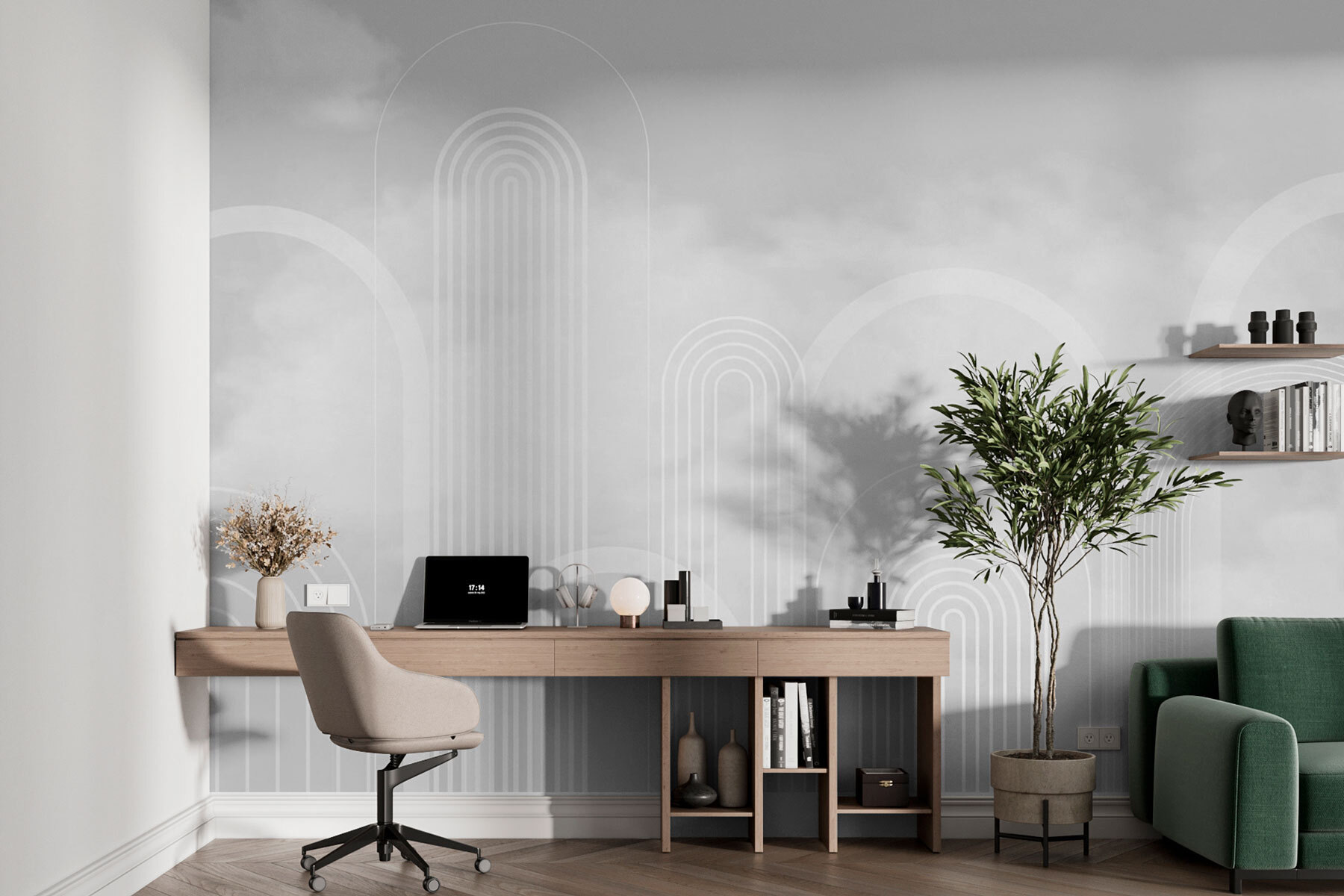 Guardate esattamente come apparirà il vostro spazio con la nuova carta da parati prima di acquistarla. Visualizzazione professionale da parte di designer esperti senza alcun costo o obbligo di acquisto.