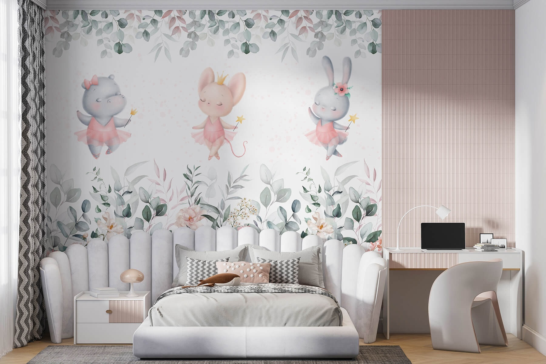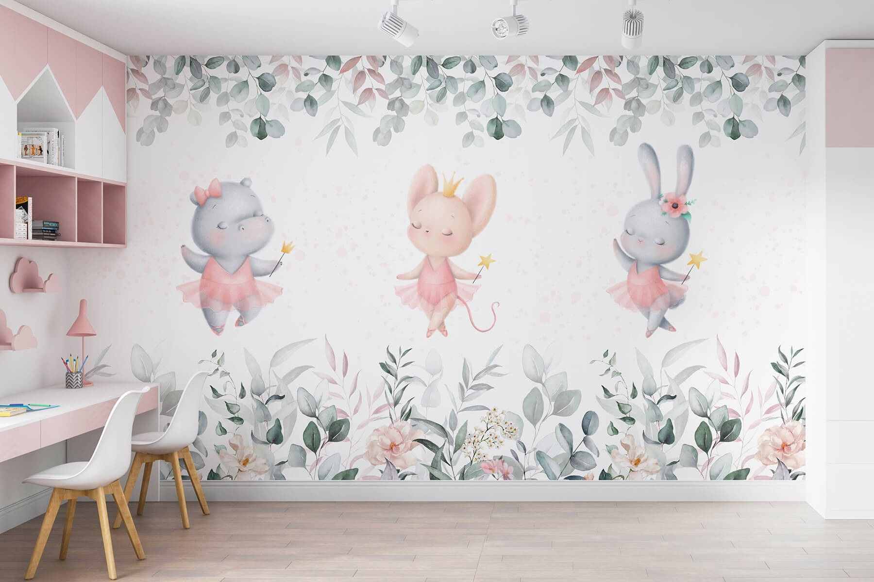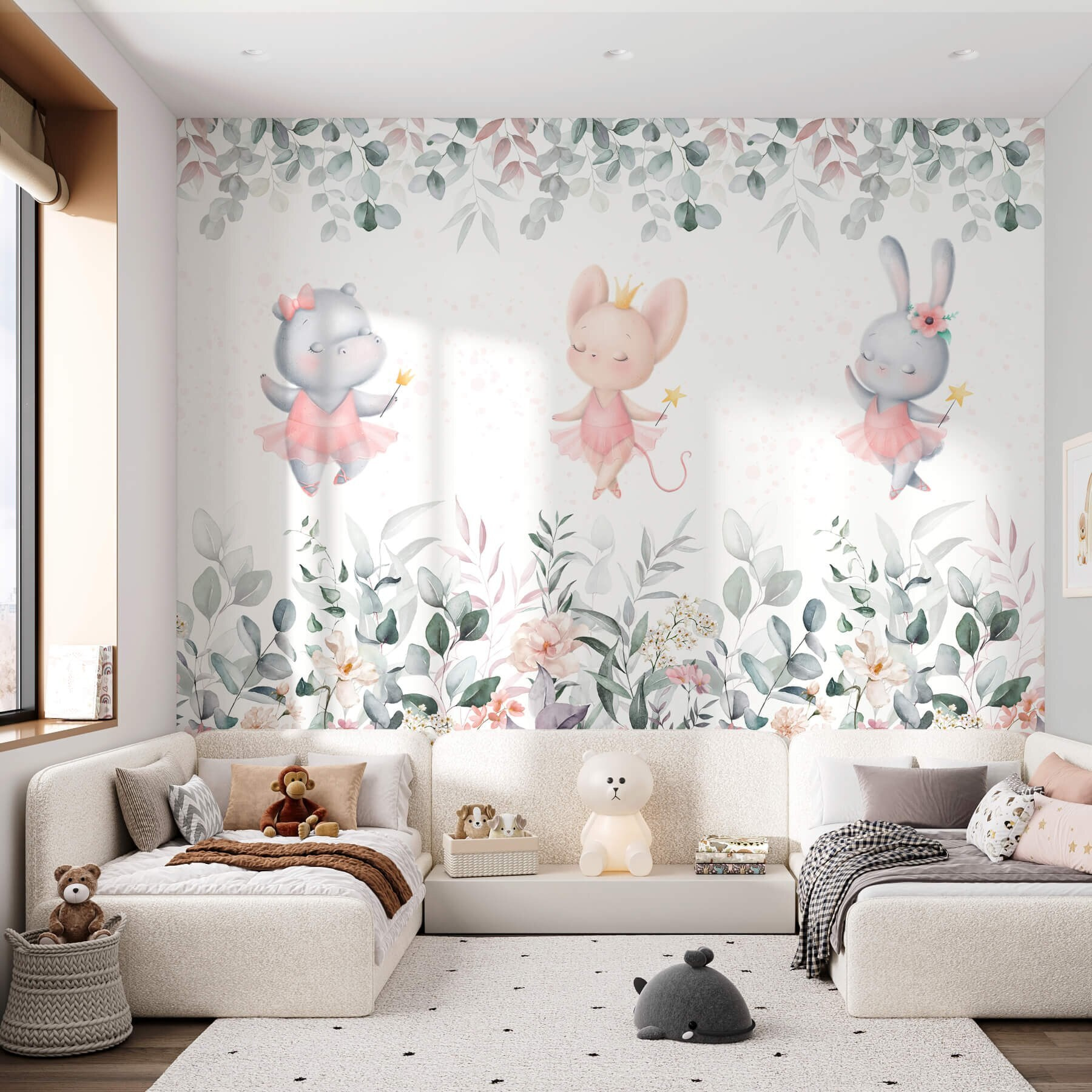 Trasformate lo spazio di una bambina in un bizzarro paese delle meraviglie con questo delizioso murale che raffigura adorabili animali in gonnellino tutù rosa! Immaginate un felice ippopotamo, un affascinante topolino e un dolce coniglietto che danzano sotto una pioggia di fiori. È come un gioioso balletto senza bisogno di scarpe da punta. Questo murale non è solo una decorazione, ma stimola l’immaginazione e le risate, rendendolo perfetto per le stanze dei giochi o le camerette. Immaginate un bambino che volteggia, ispirato dalla simpatia delle pareti, sentendosi una superstar. Chi non vorrebbe unirsi a questo divertimento? È un dolce ricordo della magia dell’infanzia, cosparso di un tocco di fascino floreale. Perfetto per chi vuole portare un sorriso in ogni stanza!