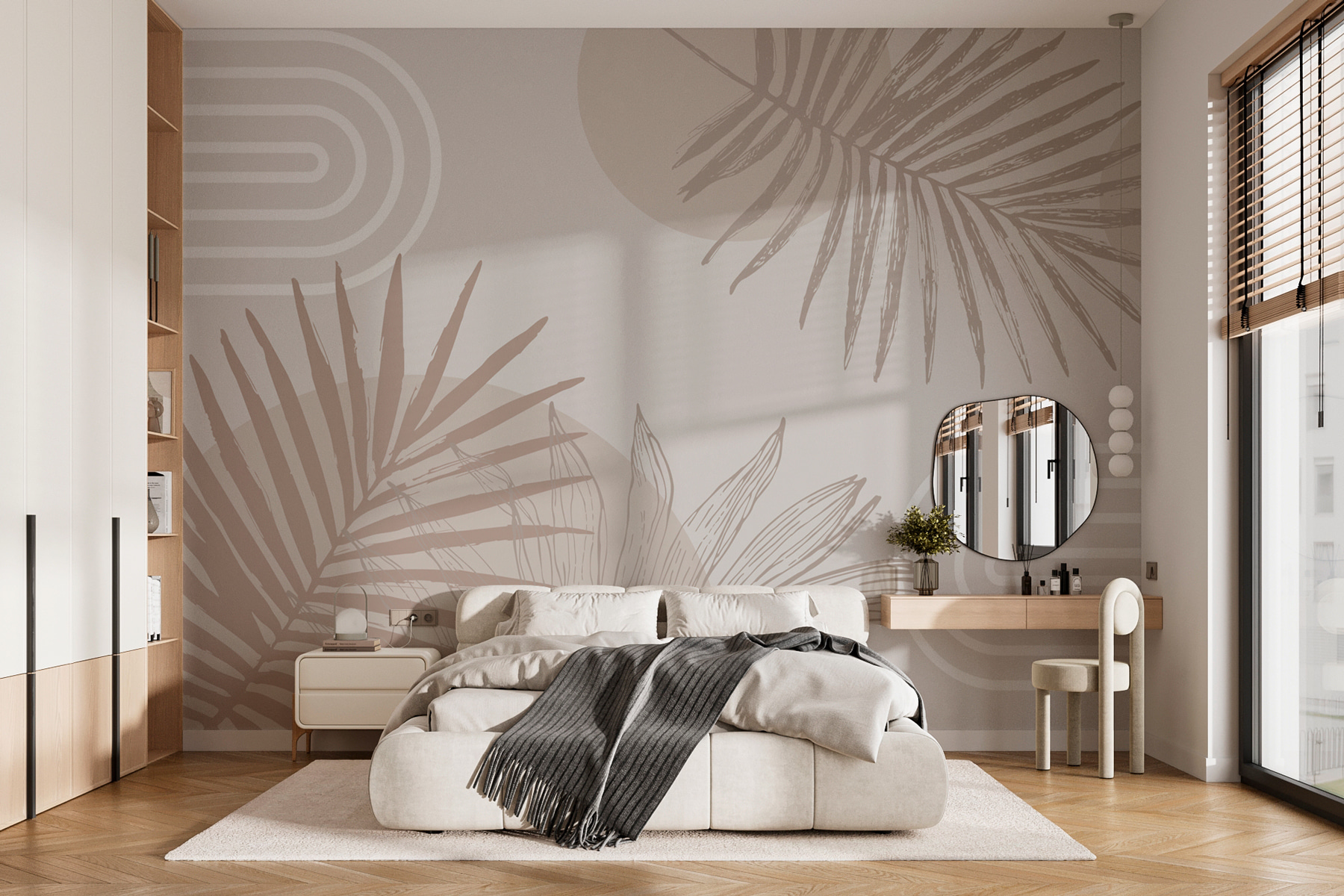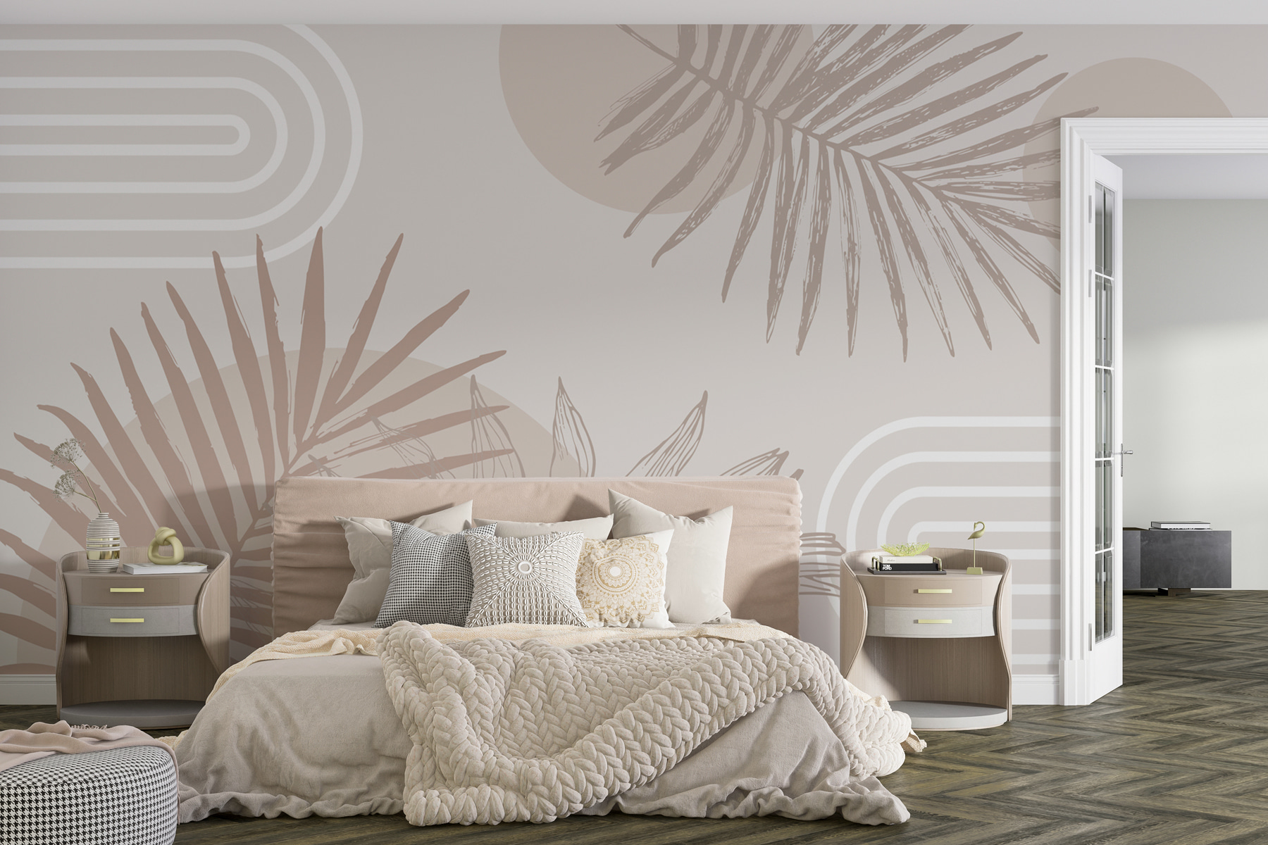 Date un’occhiata a questo favoloso murale: si tratta di toni neutri con forme geometriche divertenti e foglie di palma. Immaginatevi una pigra domenica mattina, con il caffè in mano, crogiolandovi nell’atmosfera tranquilla che questo murale trasmette. È come una mini-vacanza proprio sulla vostra parete. Perfetto per chi desidera un po’ di tropici senza il jet lag. Che si tratti di rinnovare il salotto o di abbellire l’ufficio di casa, questo disegno aggiunge un tocco di stile e sussurra: “Rilassati, sei a casa”. Le vostre pareti lo adoreranno!