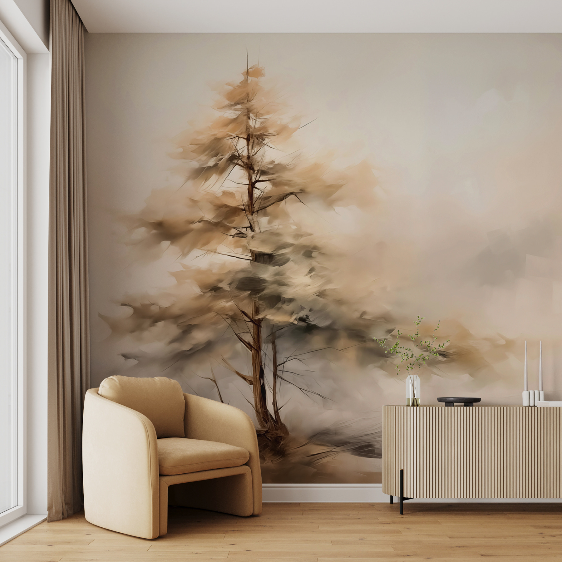 Trasformate qualsiasi stanza in un rifugio rilassante con “Tree in the Fog”. Questo splendido murale cattura la serena bellezza della natura, dove un albero solitario emerge dolcemente dalla nebbia. Sembra di entrare in un paesaggio da sogno, perfetto per quei momenti in cui si desidera respirare e rilassarsi. Immaginate di sorseggiare il vostro caffè guardando quest’opera d’arte, lasciando che le sue tonalità delicate ispirino tranquillità. È come avere un angolo accogliente di una foresta serena proprio a casa vostra. Perfetto per la camera da letto, il soggiorno o qualsiasi altro luogo che desideri un tocco di magia della natura. Lasciate che questo murale eserciti il suo fascino!