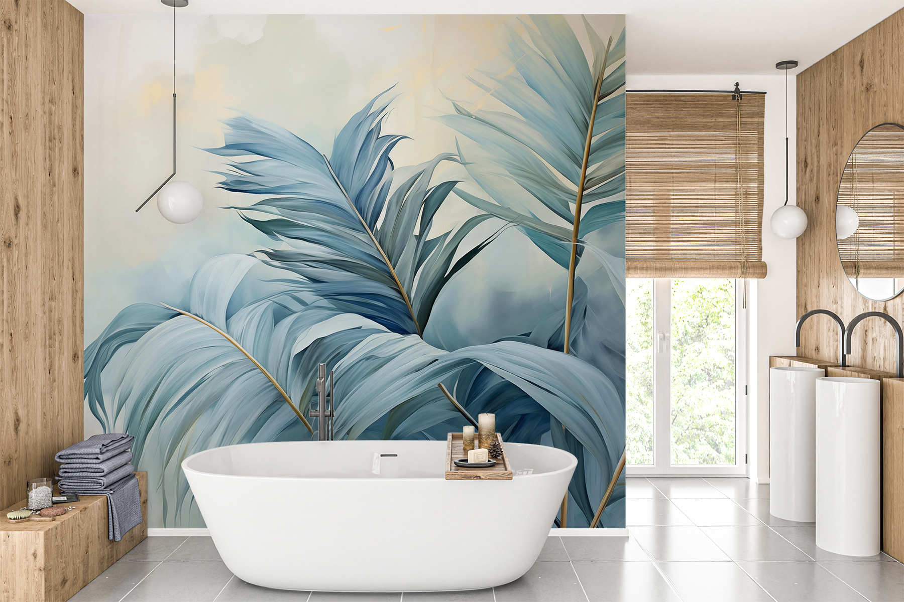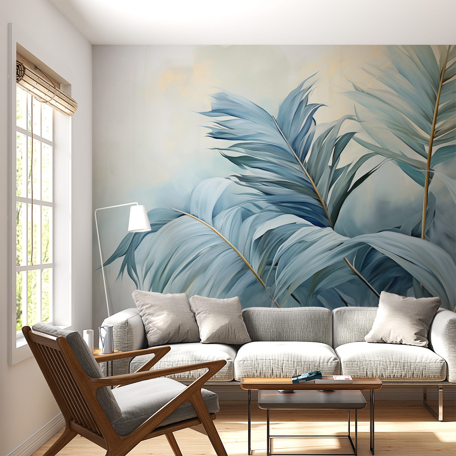 Immaginate di svegliarvi ogni mattina con i “Sussurri delle palme blu”: è come entrare in una giungla serena, proprio nel vostro salotto. I blu e i verdi rilassanti sono perfetti per creare un angolo zen dove sorseggiare il caffè del mattino o rilassarsi dopo una lunga giornata. Potreste persino iniziare a pensare che il vostro spazio abbia le sue vibrazioni da rifugio esotico. Gli uccelli saranno invidiosi di queste foglie! Inoltre, è così versatile che si adatta a quasi tutti gli stili di arredamento. Trasformate una parete semplice in una dolce fuga avvolta dalle tonalità più tenui della natura.