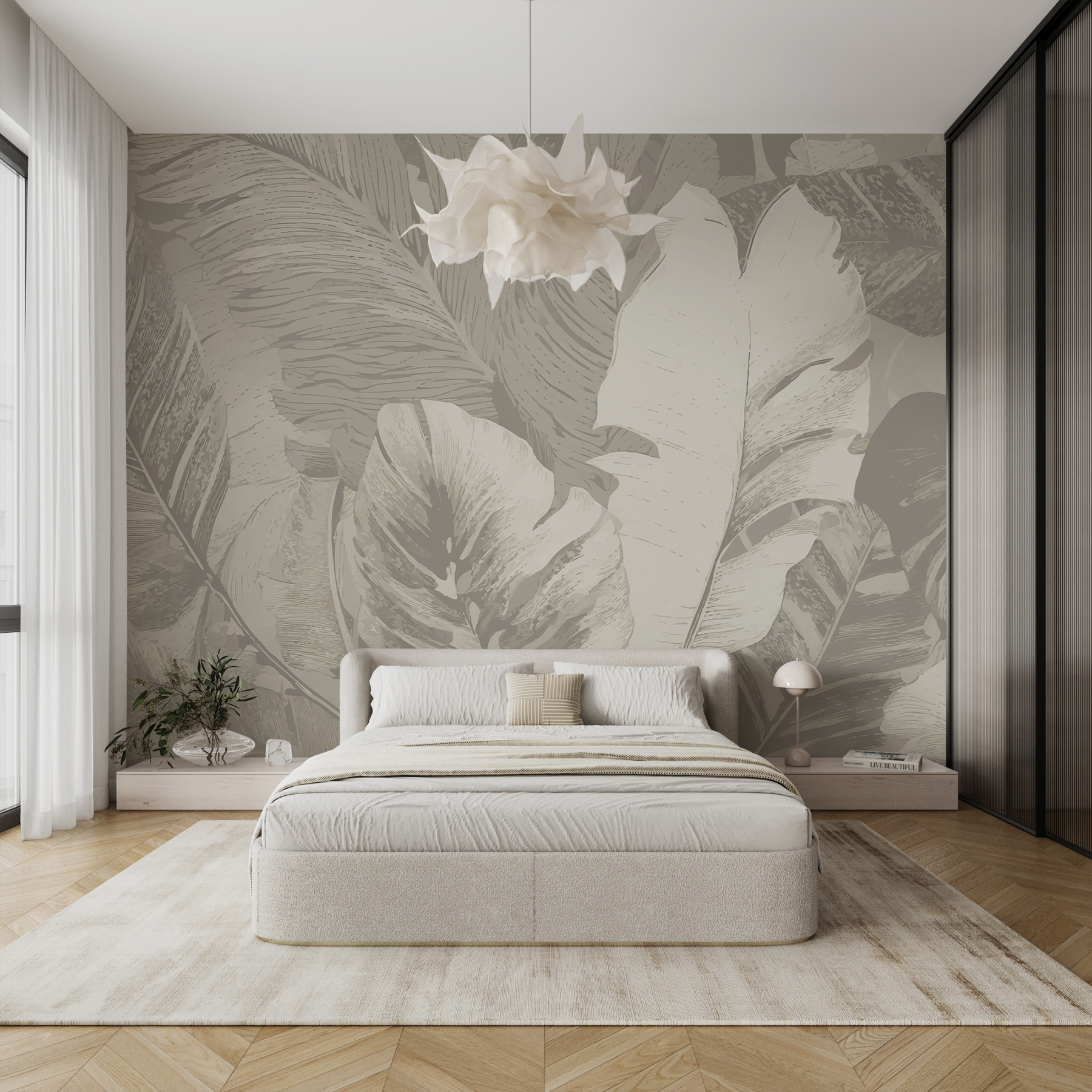 Immaginate di entrare in una stanza dove le sottili sfumature della natura portano tranquillità in un istante. Questo murale è come un dolce sussurro di una foresta tropicale, con foglie di palma e alberi della giungla che giocano a nascondino in colori tenui e rilassanti. È quasi come un rifugio segreto, proprio sulla vostra parete. Perfetto per un pigro pisolino domenicale o per un’accogliente chiacchierata con gli amici. Le texture simili al legno aggiungono un tocco di calore, facendo sentire ogni spazio come un rifugio sereno, senza i fastidiosi insetti o l’umidità! Un tocco di eleganza naturale per il vostro rifugio quotidiano.