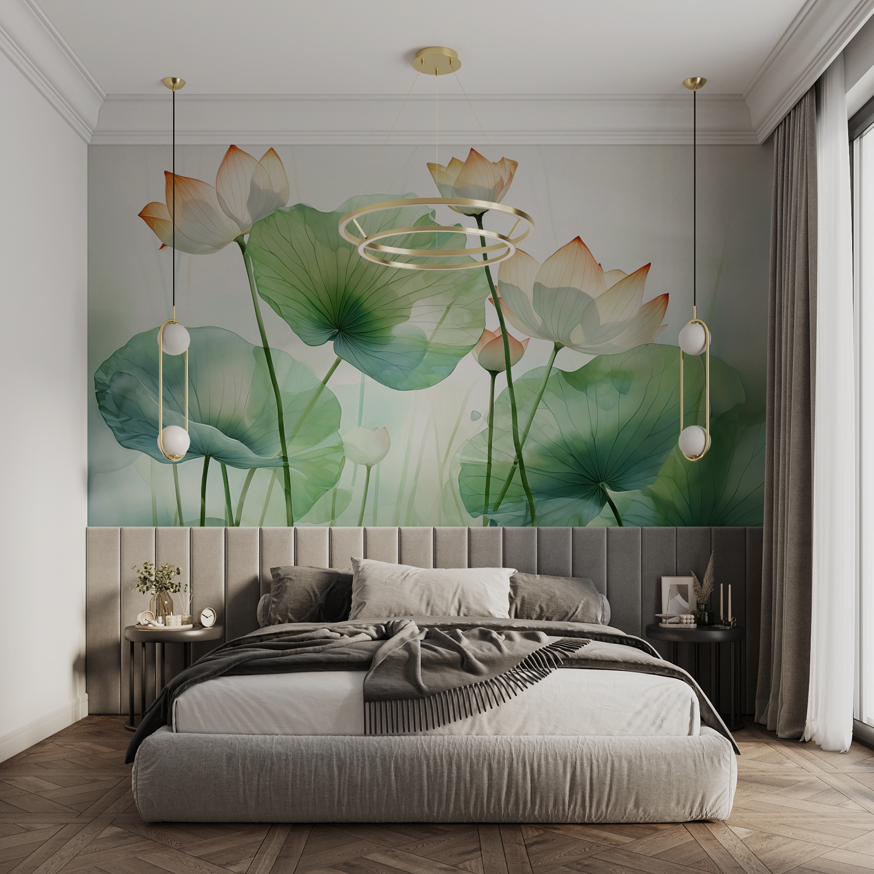 Immaginate una domenica mattina con una tazza di caffè fresco e di essere accolti da questo splendido murale: “Fioriture di loto in acque serene”. È come una piccola vacanza al lago per le vostre pareti! Le morbide tonalità del verde e del rosa giocano insieme, aggiungendo un tocco di tranquillità a qualsiasi stanza. Il loto, così grazioso, sussurra calma a ogni passaggio. Perfetto per quando il salotto ha bisogno di una leggera spinta verso lo zen. Non è solo arredamento; è uno stato d’animo, una vibrazione. Chi avrebbe mai immaginato che la natura potesse abbracciarvi anche solo con una parete?