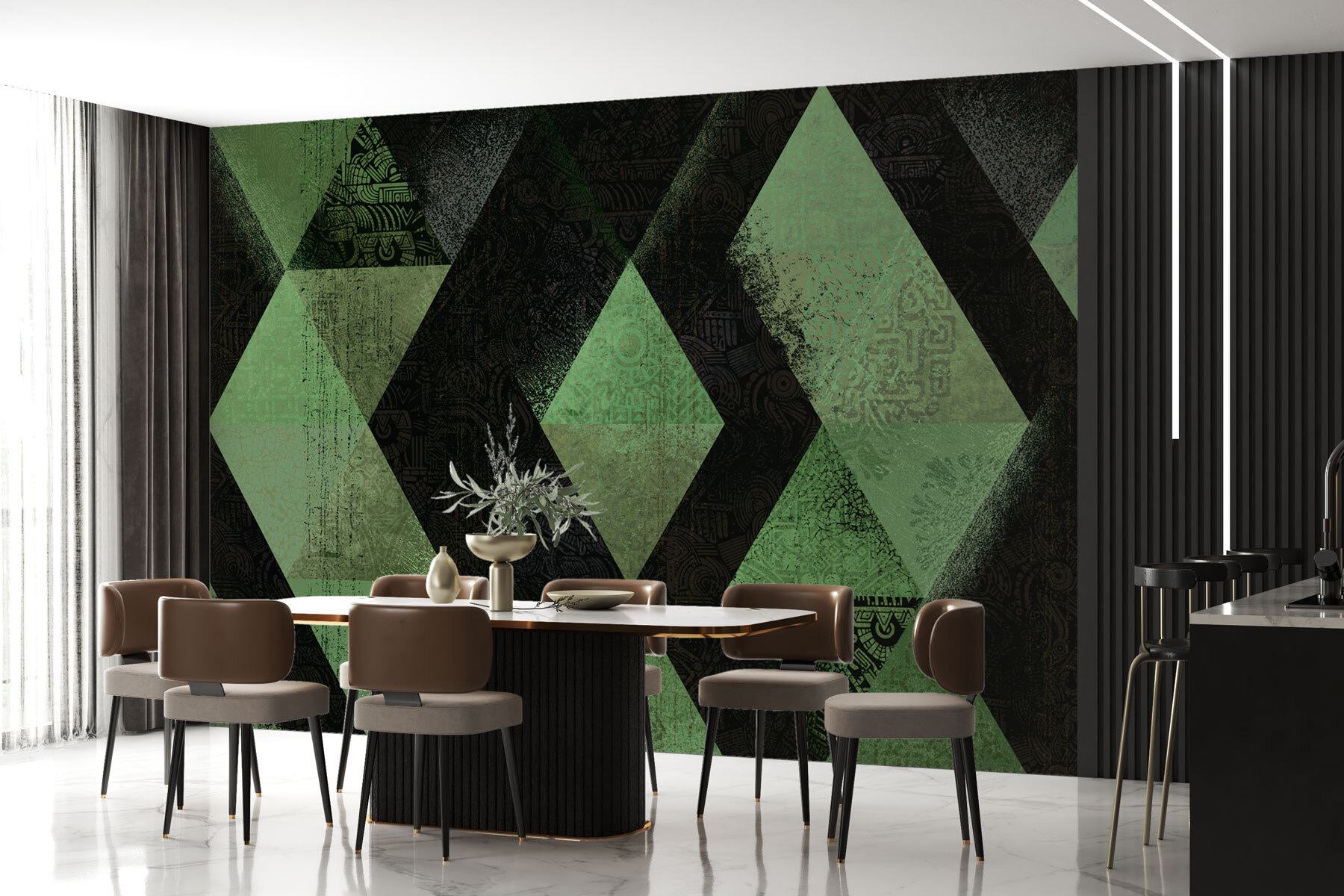 Trasformate una parete semplice in un argomento di conversazione con questo murale a rombi neri e verdi. Ha un’atmosfera fresca e artistica che stimola la curiosità, perfetta per chi ama l’arredamento moderno! Immaginate di entrare nella vostra stanza e di sentire un’inaspettata esplosione di energia grazie a queste forme audaci. Ogni diamante sembra raccontare una storia, mescolando le texture come se avesse vissuto un’avventura colorata. Che si tratti di un soggiorno vivace o di un tranquillo angolo lettura, questo murale ha il potere di rendere fresco e invitante qualsiasi spazio. Lasciate che siano le pareti a parlare!