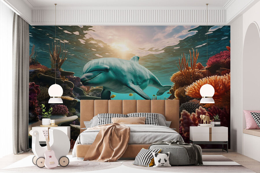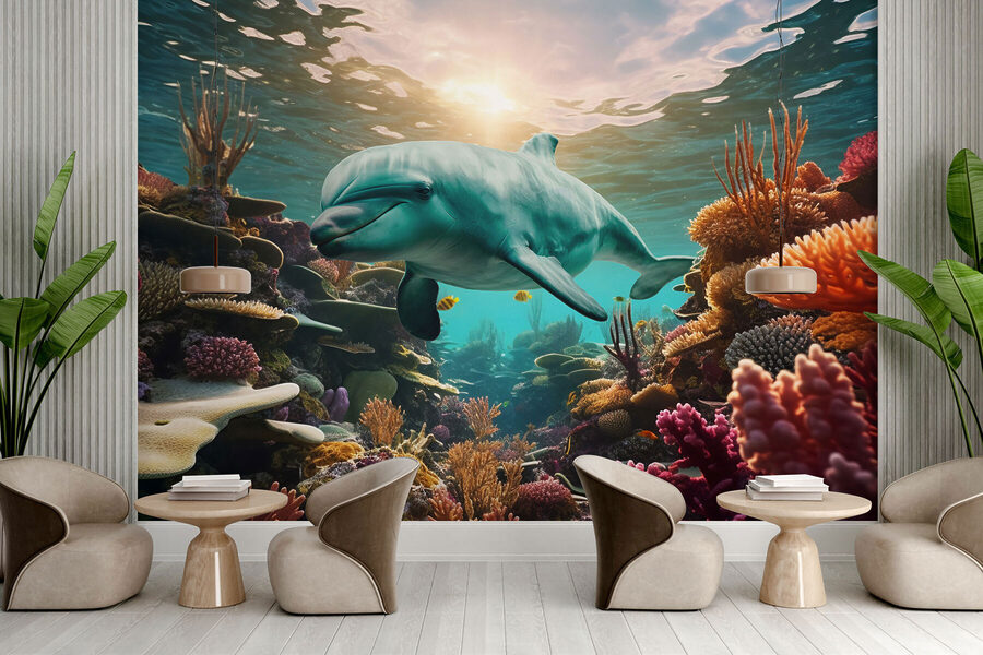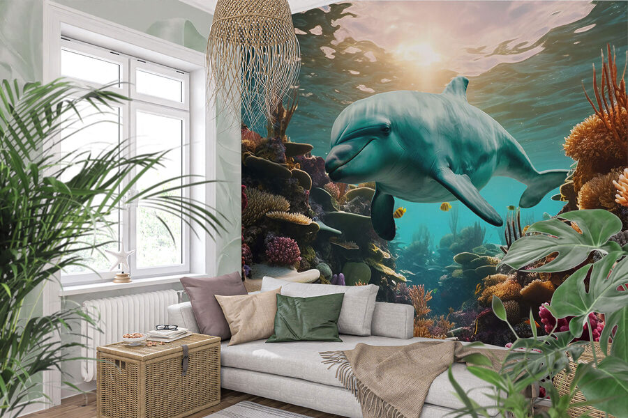 Immergetevi in un’atmosfera di serenità con questo murale che raffigura un delfino che nuota serenamente in un oceano vibrante. Immaginatevi le pareti trasformate in una sognante fuga sottomarina, animata da coralli colorati e pesci allegri. È come avere una finestra su un oceano luminoso e tranquillo proprio a casa vostra. Gli amici si fermeranno sicuramente a guardare, chiedendosi se sono entrati in un acquario. Immaginate di svegliarvi davanti a questa splendida scena e di sentirvi ogni giorno un po’ più rilassati. Non si tratta solo di arredamento, ma di un’avventura quotidiana in attesa di essere vissuta. Perfetto per aggiungere un’atmosfera marina e ventilata, questo murale porta il sole e la gioia in ogni spazio!