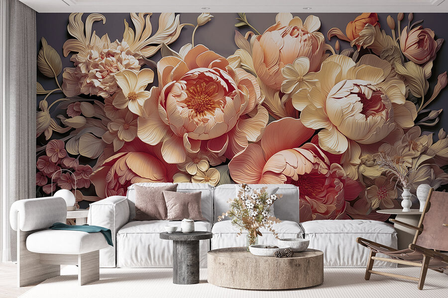 Immaginate di entrare in uno spazio in cui le vibranti peonie sbocciano sulle pareti, come in un’eterna festa in giardino. Questo murale, con il suo morbido sfondo grigio, mette perfettamente in risalto i colori vivaci dei fiori, dando una sensazione di freschezza e accoglienza. È come una ventata di primavera, indipendentemente dalla stagione esterna.