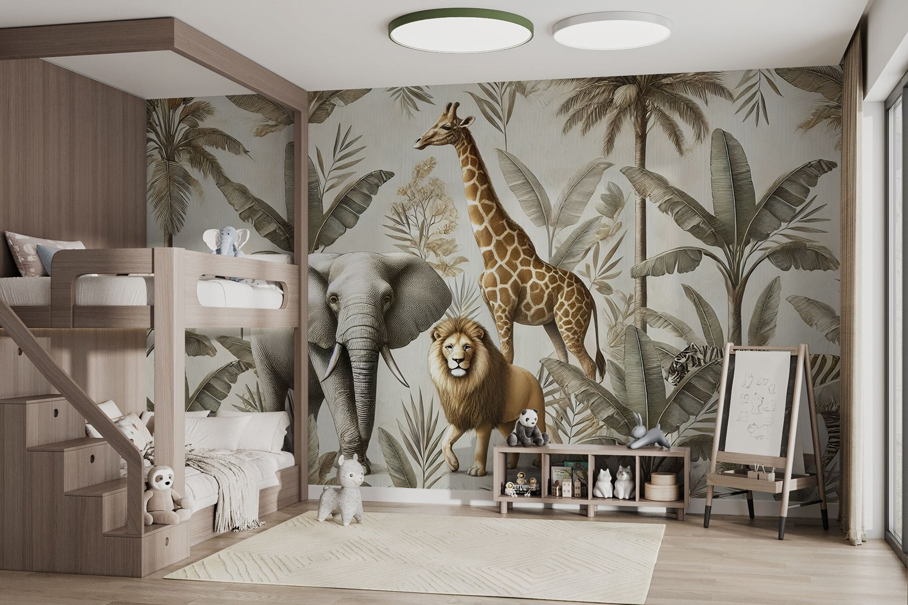 Trasformate il vostro spazio in una fuga esotica con questo splendido murale con una vivace scena della giungla. Immaginate un audace elefante, una regale giraffa e un maestoso leone che si aggirano tra piante lussureggianti e palme: come potrebbe una stanza non sentirsi più avventurosa? È come portare una fetta di natura selvaggia a casa vostra. La famiglia e gli amici ameranno chiacchierare della feroce tigre che si nasconde nel verde mentre sorseggiano il caffè. Inoltre, i toni caldi e terrosi creano un’atmosfera rilassante, perfetta per rilassarsi o lasciarsi ispirare. Questo murale non è solo una decorazione: è una piccola avventura che aspetta di accadere!