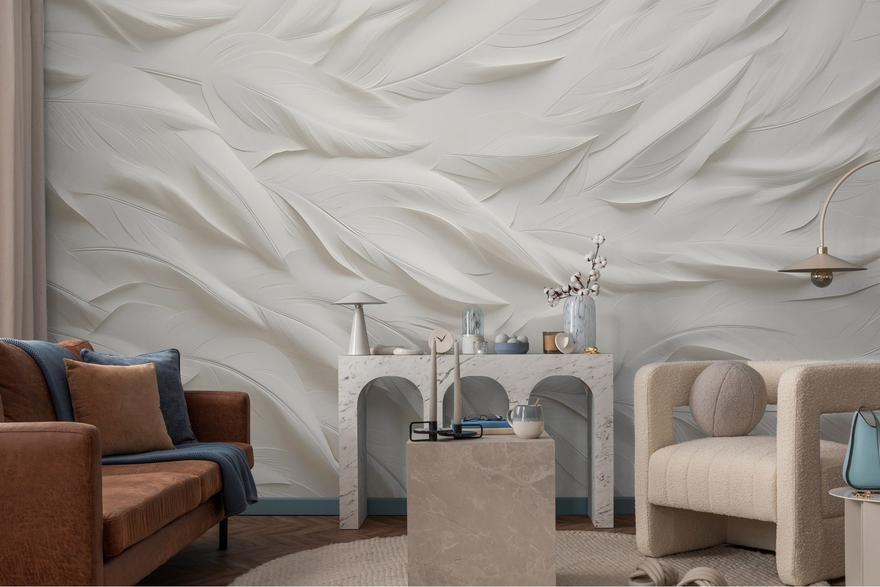Carta da parati Disegno di piume bianche su una superficie bianca (SKU: w02008)
