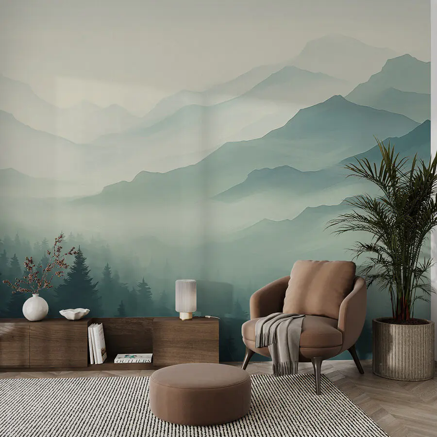 Trasformate il vostro spazio con questo incantevole murale con un paesaggio montano nebbioso baciato da alberi gentili. Immaginate di svegliarvi con le tonalità calme delle montagne, come se il sussurro della natura salutasse ogni giorno. La morbida nebbia avvolge le cime, creando uno sfondo quasi da sogno, perfetto per mattinate accoglienti o serate tranquille con una tazza di tè.