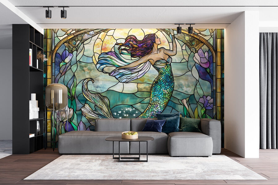 Immergetevi in un colorato mondo sottomarino con questo murale che raffigura una sirena in una splendida vetrata. Immaginate di sorseggiare il vostro caffè mattutino immergendovi nelle gioiose tonalità di blu e verde dell’oceano che si riversano sulle vostre pareti. Le delicate volute e le linee fluide creano un senso di tranquillità che addolcisce qualsiasi spazio. Immaginate le serate al cinema con gli amici, dove tutti sono attratti dal fascino magico della sirena. Questo murale non si limita a decorare una stanza, ma invita a raccontare storie, a sognare a occhi aperti e a creare un pizzico di fantasia nella vita di tutti i giorni. Perfetto per gli amanti della natura o per chi desidera un tocco di mare nella propria casa.