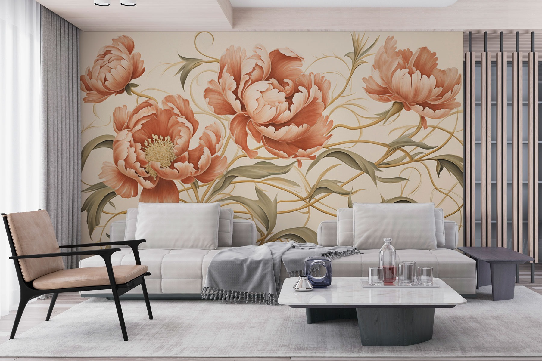 Trasformate qualsiasi stanza in un accogliente rifugio botanico con questo splendido murale di fiori e rampicanti. Immaginatevi la luce del sole che entra e queste bellissime peonie, nei toni del rosa e del pesca, che danzano su uno sfondo caldo. È come portare un piccolo giardino in casa senza il fastidio di doverlo innaffiare!