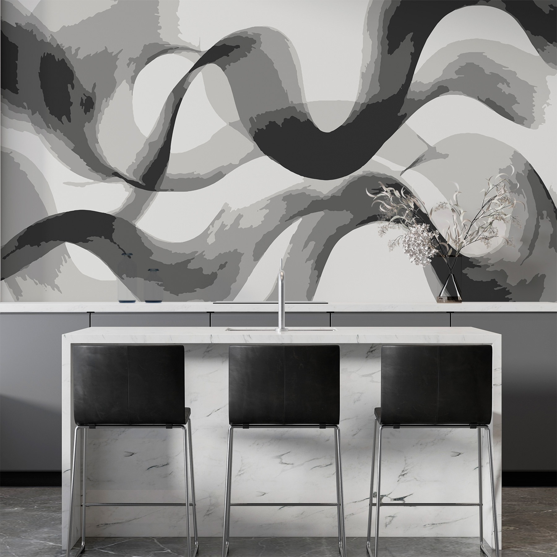 Trasformate il vostro spazio con questo splendido “Murales grigio e bianco a linee ondulate”. Immaginate di entrare in una stanza moderna e invitante, dove dolci curve di grigio e bianco danzano intorno alle pareti. È come avvolgere la vostra casa in una sciarpa accogliente ed elegante!