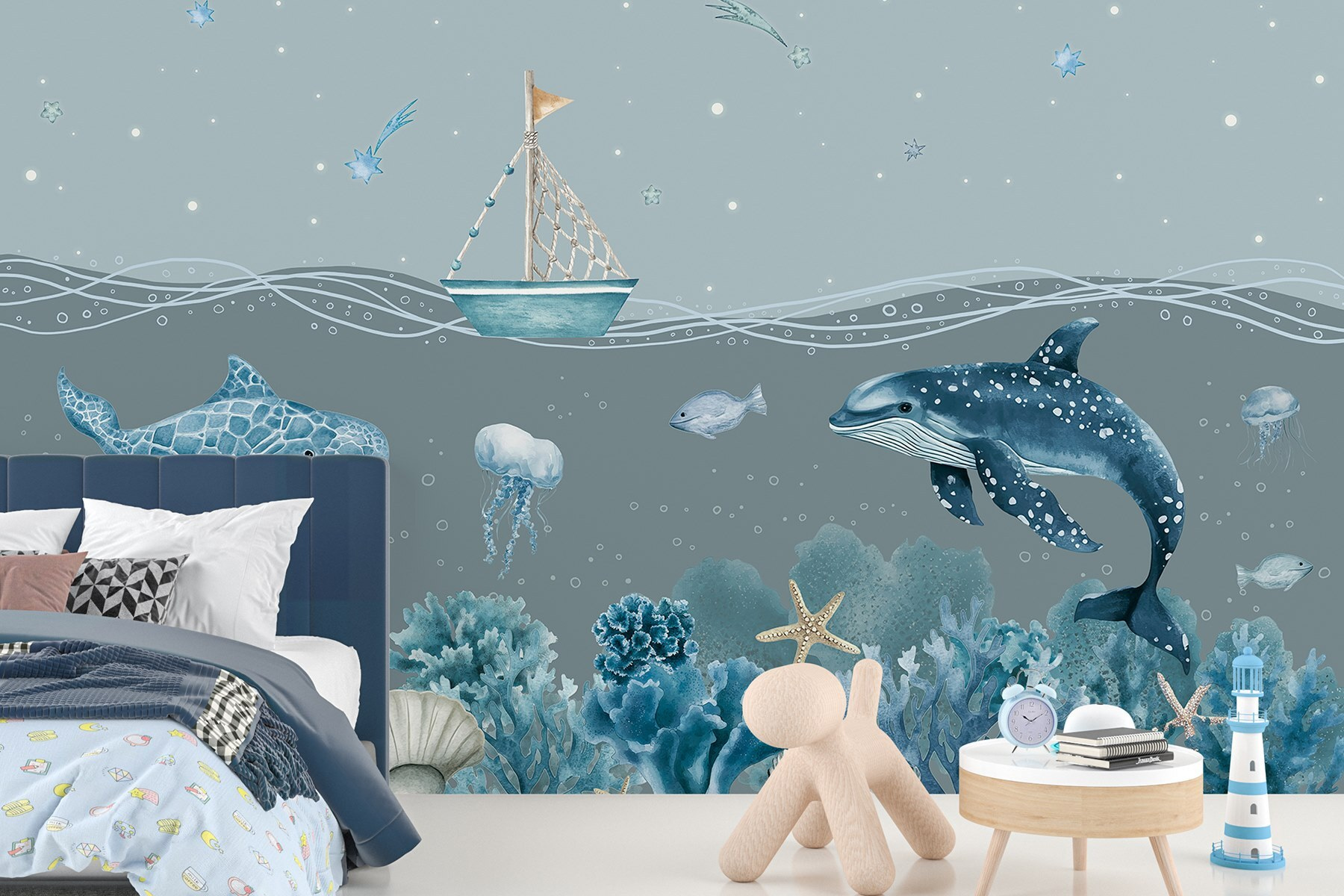 Trasformate il vostro spazio in una serena fuga sottomarina con il murale “Sea Life”. Immaginate di svegliarvi ogni giorno con delfini giocosi e meduse gentili che danzano sulle vostre pareti. Questa scena da sogno ritrae un’incantevole barchetta che scivola in un mare tranquillo, circondata da vivaci coralli e stelle marine. È come avere un pezzo di oceano a casa, senza la salsedine! Perfetto per la camera dei bambini o anche per un accogliente angolo lettura, questo murale dona un tocco di estrosità e di calma. Lasciate che i colori vi avvolgano, creando un’atmosfera tranquilla che potrebbe ispirare sogni ad occhi aperti di avventure nell’oceano.
