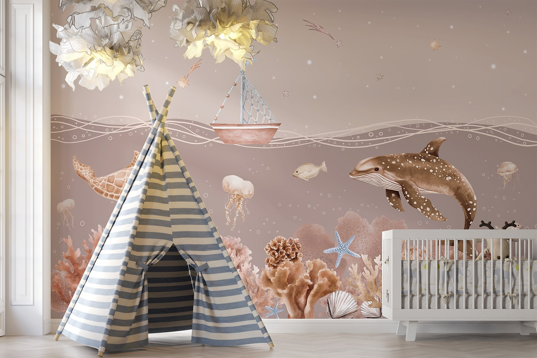 Immergetevi in un mondo di fantasia con questo splendido murale, “Sea Life with a Boat and Fish”. Immaginatevi una dolce barca a vela che naviga al di sopra di una giocosa fauna marina che sembra quasi reale. È come un’avventura subacquea segreta proprio nel vostro salotto! Immaginate i bambini (o gli adulti!) che sognano storie sottomarine mentre guardano le tartarughe, le meduse e i vivaci coralli. Questo murale conferisce un’atmosfera calma e marina a qualsiasi spazio e aggiunge un tocco di allegria. Perfetto per case, asili nido o ovunque sia necessario un tocco di magia oceanica. Chi non sorriderebbe di fronte a questa scena allegra?
