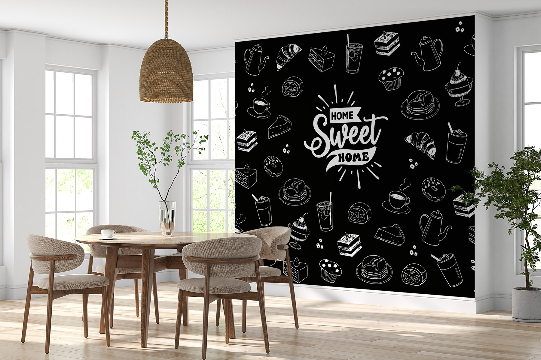 Trasformate il vostro spazio con questo affascinante murale in bianco e nero, caratterizzato da una deliziosa serie di illustrazioni di cibo. Immaginate di accoccolarvi nella vostra cucina, circondati da giocosi schizzi di cupcake, tazze di caffè e pasticcini. È come se ci fosse un piccolo e amichevole caffè proprio sulla vostra parete, che vi invita a concedervi un po’ di relax. Inoltre, lo slogan “Home Sweet Home” aggiunge un tocco commovente, perché chi non ama un richiamo al proprio luogo felice? Perfetto per coloro che apprezzano un buon spuntino e una bella risata, questo murale trasmette un’atmosfera stravagante che apprezzerete ogni giorno. È una decorazione che parla in modo delizioso!