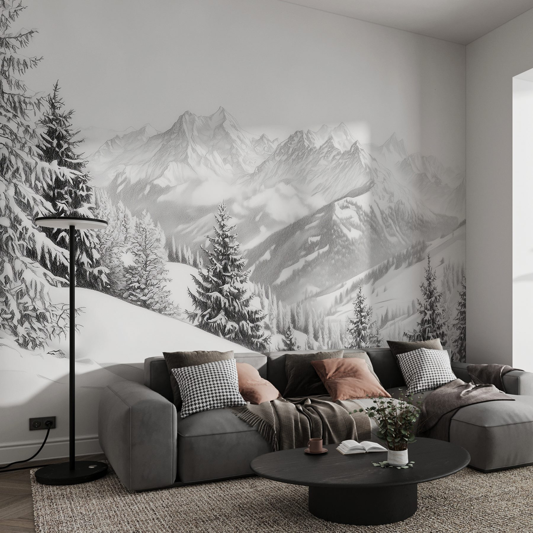 Trasformate qualsiasi stanza in una serena fuga invernale con questo splendido murale di montagne innevate e alberi maestosi. Immaginatevi accoccolati con una bevanda calda, ammirando il paesaggio mozzafiato che sembra a un soffio da voi. I bianchi tranquilli e i grigi tenui evocano una calma che avvolge come una calda coperta, perfetta per le notti fredde. Aggiungete un tocco di natura selvaggia alle vostre pareti e lasciate che il vostro spazio respiri aria di montagna. Ideale per gli amanti della natura e per chi sogna a occhi aperti, questo murale invita a pensieri pacifici e a un senso di avventura, anche dal divano.