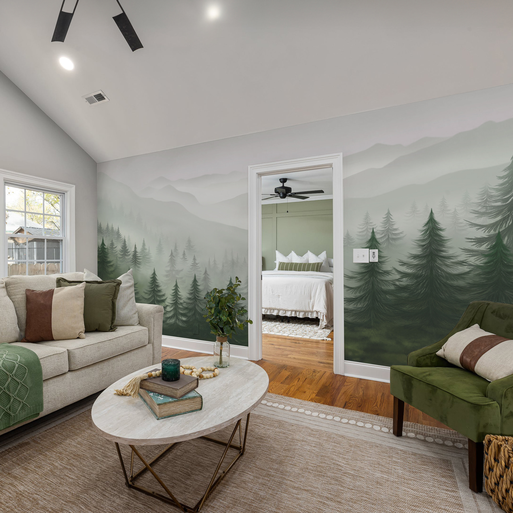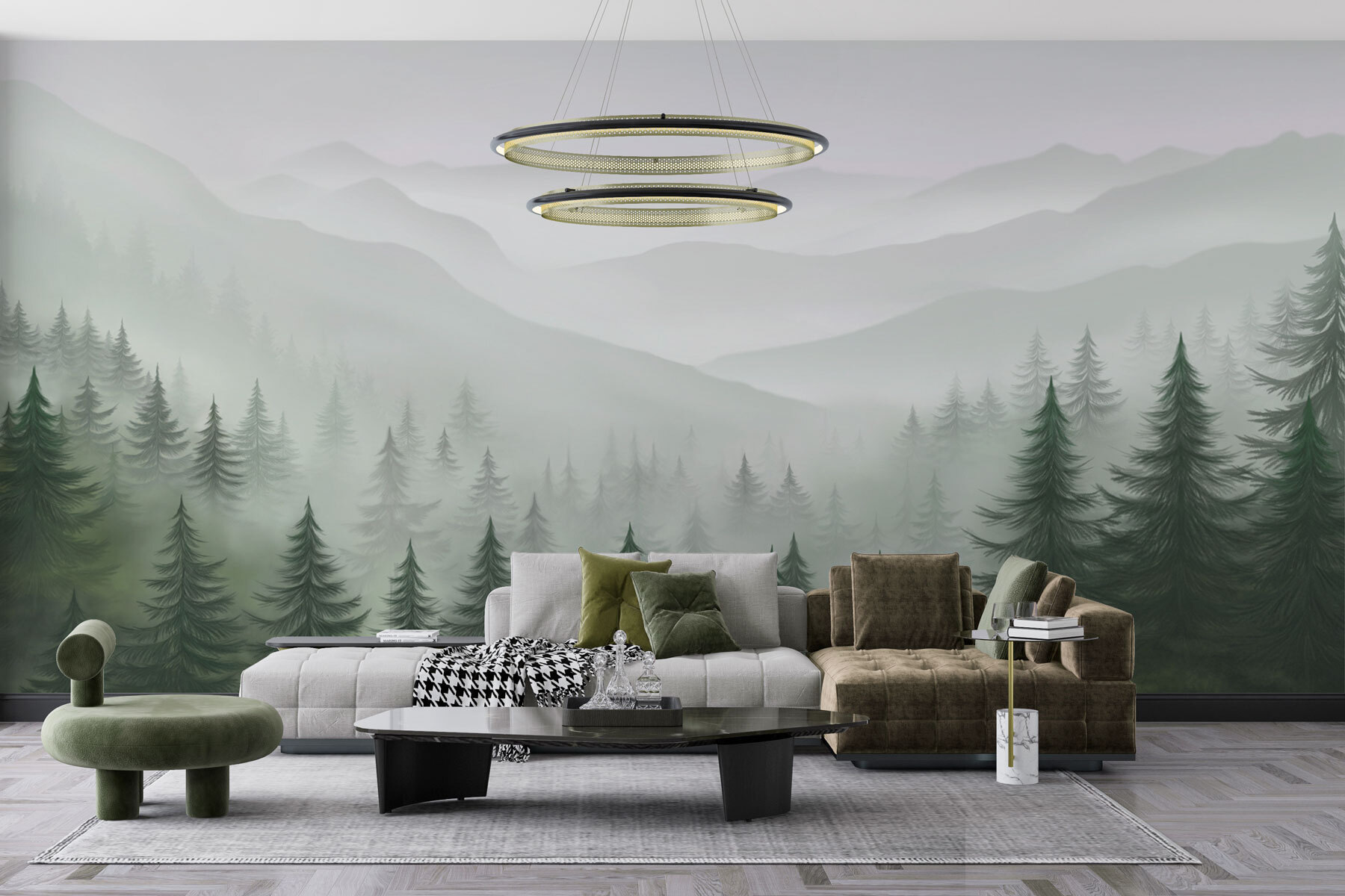 Carta da parati Paesaggio nebbioso con alberi e montagne Carta da parati Paesaggio nebbioso con alberi e montagne