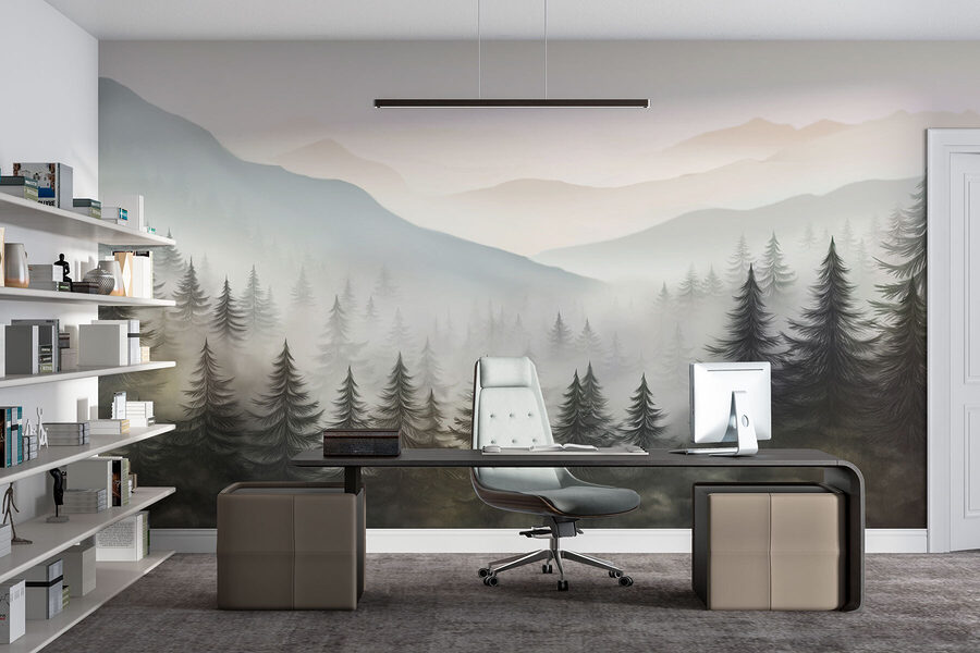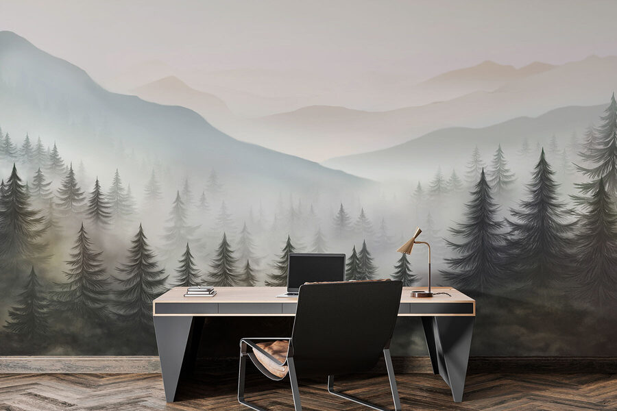 Carta da parati Paesaggio nebbioso con alberi e montagne (SKU: w02450v1)