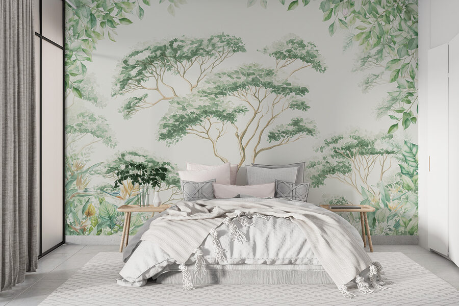 Trasformate il vostro spazio con questo delizioso “Murales di alberi e piante”. Immaginate di immergervi in una foresta serena ogni volta che entrate nella stanza: sembra una mini-vacanza, vero? Il verde tenue e le linee delicate portano una ventata di aria fresca, facendo sentire viva qualsiasi parete.