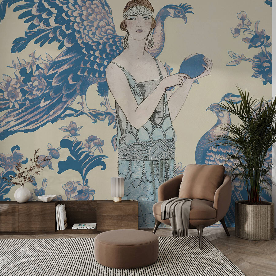 Elevate il vostro spazio con questo splendido murale che raffigura una donna aggraziata che tiene in mano un oggetto rotondo blu, circondato da estrosi pavoni e fiori delicati. È come avere un’opera d’arte da sogno direttamente sulla parete! Immaginate di svegliarvi ogni giorno con questo tocco di colore ed eleganza, perfetto per creare un’atmosfera serena. Che si tratti di un angolo accogliente o di un soggiorno chic, questo murale invita a entrare in un mondo di bellezza. Gli ospiti non potranno fare a meno di ammirarlo e potrebbe ispirare una conversazione spontanea sull’arte, sui viaggi o sugli inafferrabili pavoni, perché chi non ama un po’ di glamour?