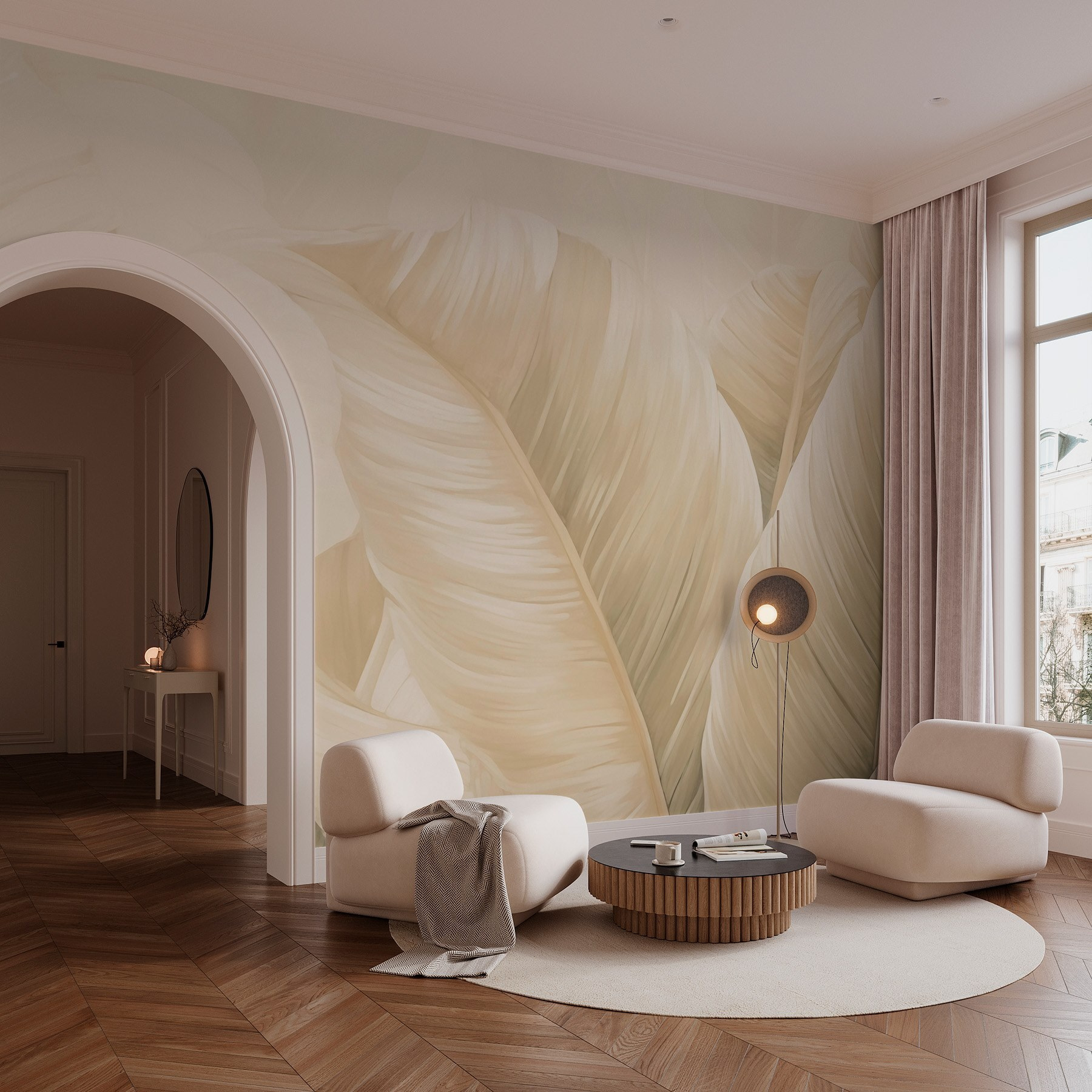 Immaginate di entrare in un mondo di texture morbide e toni tenui, dove ogni sguardo alla parete sembra un dolce abbraccio. Questo murale, con il suo rilassante disegno di foglie di palma, sussurra di paradisi tropicali e mette a terra qualsiasi spazio con la sua presenza serena. Immaginate serate accoglienti, luci calde e quella perfetta miscela di natura e calma. Gli amici potrebbero fermarsi a metà conversazione, affascinati dalla sobria bellezza della parete. È come portare un pezzo di foresta silenziosa nella vostra casa, senza le zanzare! Perfetto per soggiorni, camere da letto o anche per quei piccoli angoli che aspettano di essere amati.