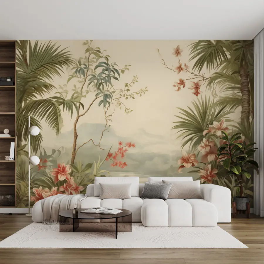 Trasformate il vostro spazio in un’oasi serena con questo splendido murale con fiori lussureggianti e alberi tropicali. Immaginate di entrare in una giungla tranquilla, dove ogni sguardo sembra una mini-vacanza. Le delicate tonalità di verde e i fiori tenui creano un’atmosfera rilassante che sussurra relax. Perfetto per un accogliente angolo lettura o per un vivace salotto, questo murale invita la natura all’interno. Immaginatevi mentre sorseggiate un tè, circondati da una flora che potrebbe far invidia persino alla vostra collezione di piante da interno. Porta un po’ di atmosfera e freschezza su qualsiasi parete; è come una boccata d’aria fresca, senza gli insetti!