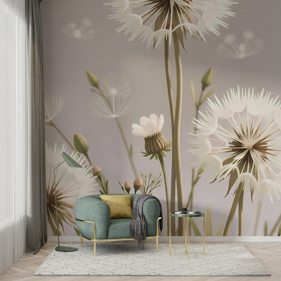 Trasformate il vostro spazio con il murale “Delicate Blooms in Soft Palette”. Questo splendido disegno porta un tocco di natura all’interno dell’abitazione, con deliziosi denti di leone e fiori delicati. Immaginate di svegliarvi e di essere accolti da questa opera d’arte rilassante: è come un dolce sussurro dal giardino!