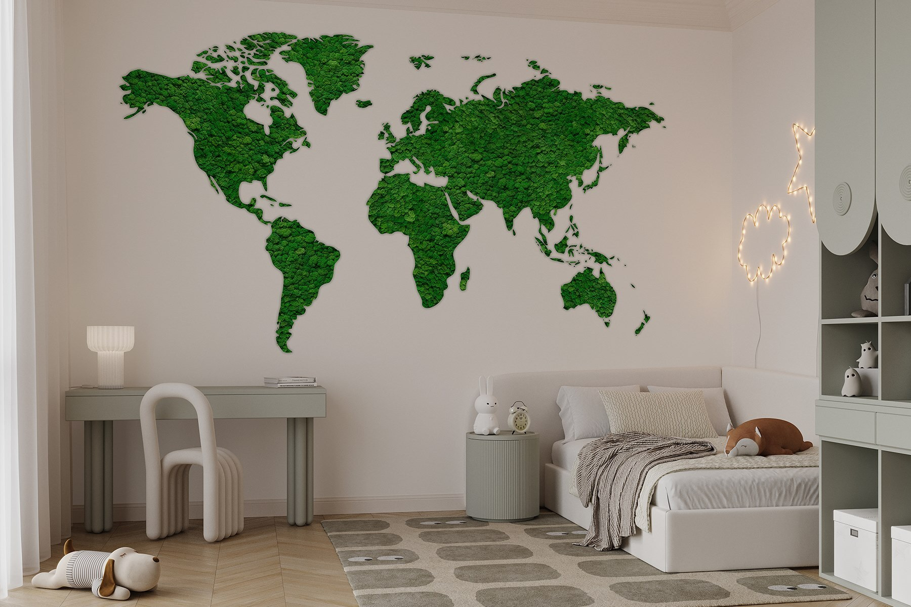 Trasformate il vostro spazio con questo splendido murale che raffigura una mappa del mondo interamente composta da piante verdi e rigogliose. È come portare un pezzo di natura in casa, senza bisogno di annaffiare! Immaginatevi di accoccolarvi in una stanza in cui i continenti sono realizzati con piante verdi e vivaci. Stimola la curiosità e la conversazione, perfetta per quei momenti in cui ci si chiede “dov’è quel posto?”. Inoltre, emana un’atmosfera rilassante, come una profonda boccata d’aria fresca. Che si tratti di un salotto o di un ufficio, questo murale è destinato a ispirare la voglia di viaggiare. Chi avrebbe mai detto che l’arredamento potesse essere così avventuroso?