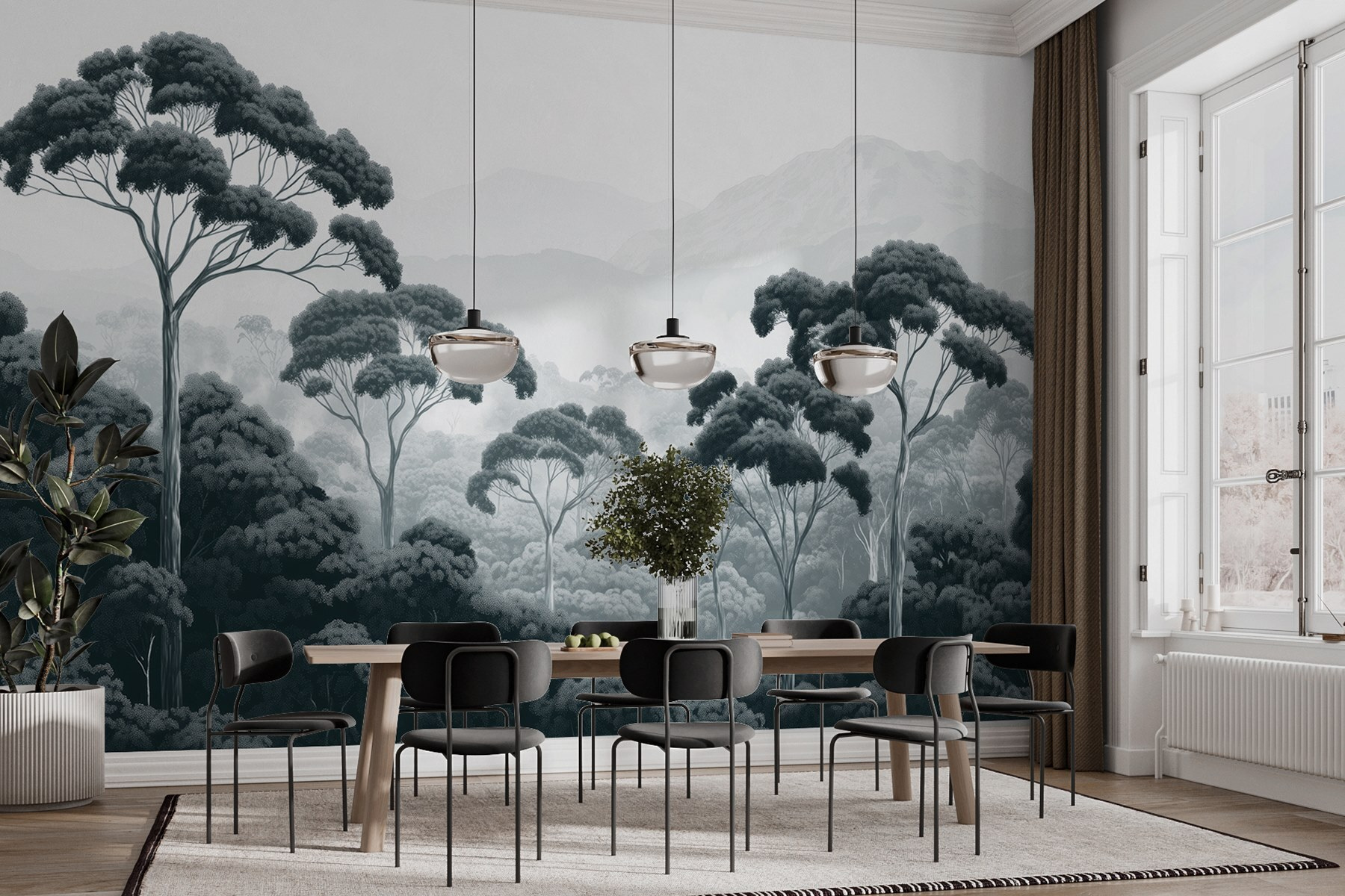 Trasformate qualsiasi stanza in una fuga serena con questo splendido murale che raffigura una foresta con alberi imponenti e montagne nebbiose. Immaginate di sorseggiare il vostro caffè mattutino circondati dalla natura, senza zanzare fastidiose, solo vibrazioni pure! L’opera d’arte è caratterizzata da una rilassante tavolozza in bianco e nero, perfetta per creare uno spazio accogliente e riflessivo. Che si tratti di un salotto o di un ufficio, questo murale potrebbe ispirare sogni ad occhi aperti di escursioni nei boschi o di accoccolarsi con un buon libro. È come avere una fetta dei grandi spazi aperti proprio sulla parete. Chi avrebbe mai detto che la natura potesse essere così chic?