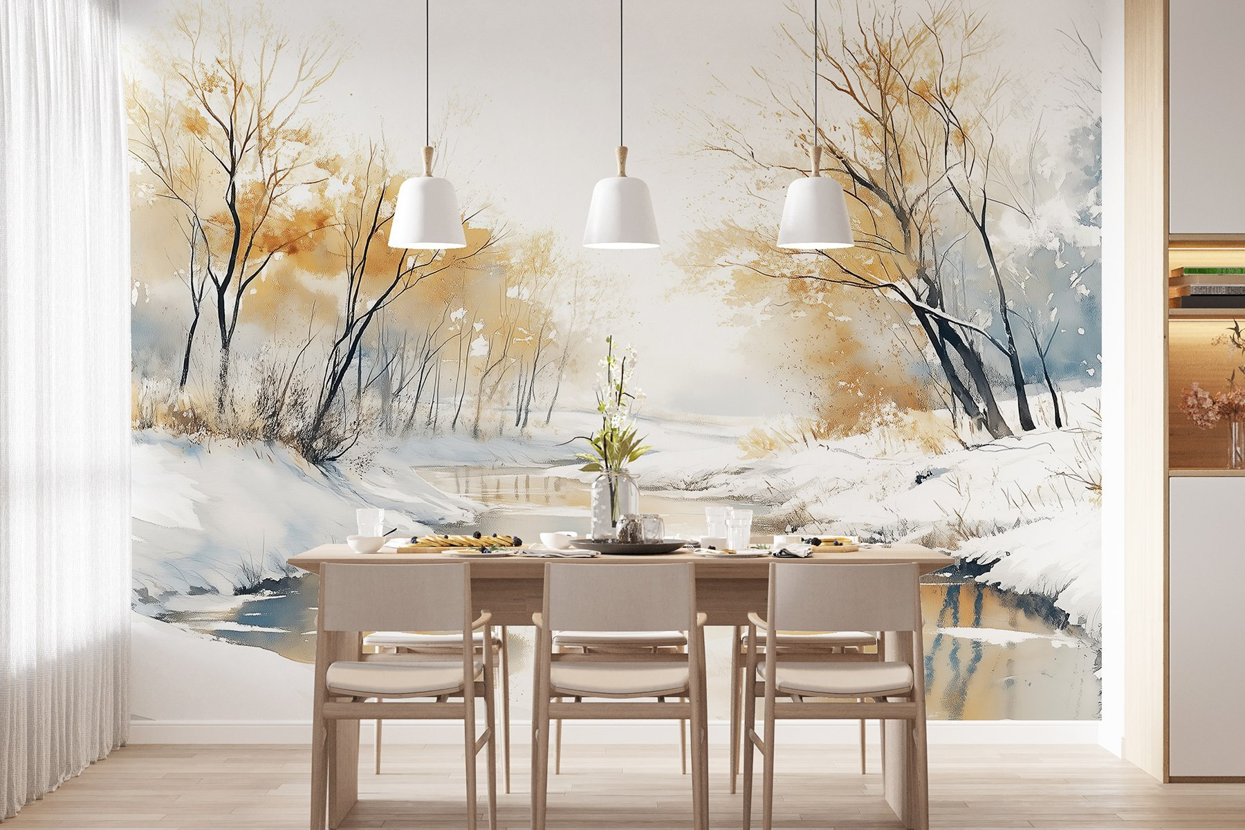 Immaginate di entrare in un paese delle meraviglie innevato ogni volta che entrate nella vostra stanza. Questo murale “Carta da parati River with Snow and Trees” cattura questa atmosfera serena come una coperta accogliente in una giornata fredda. Le morbide tonalità degli acquerelli si fondono delicatamente, creando una tranquilla scena fluviale incorniciata da alberi delicati, il tutto spolverato da uno strato di neve.