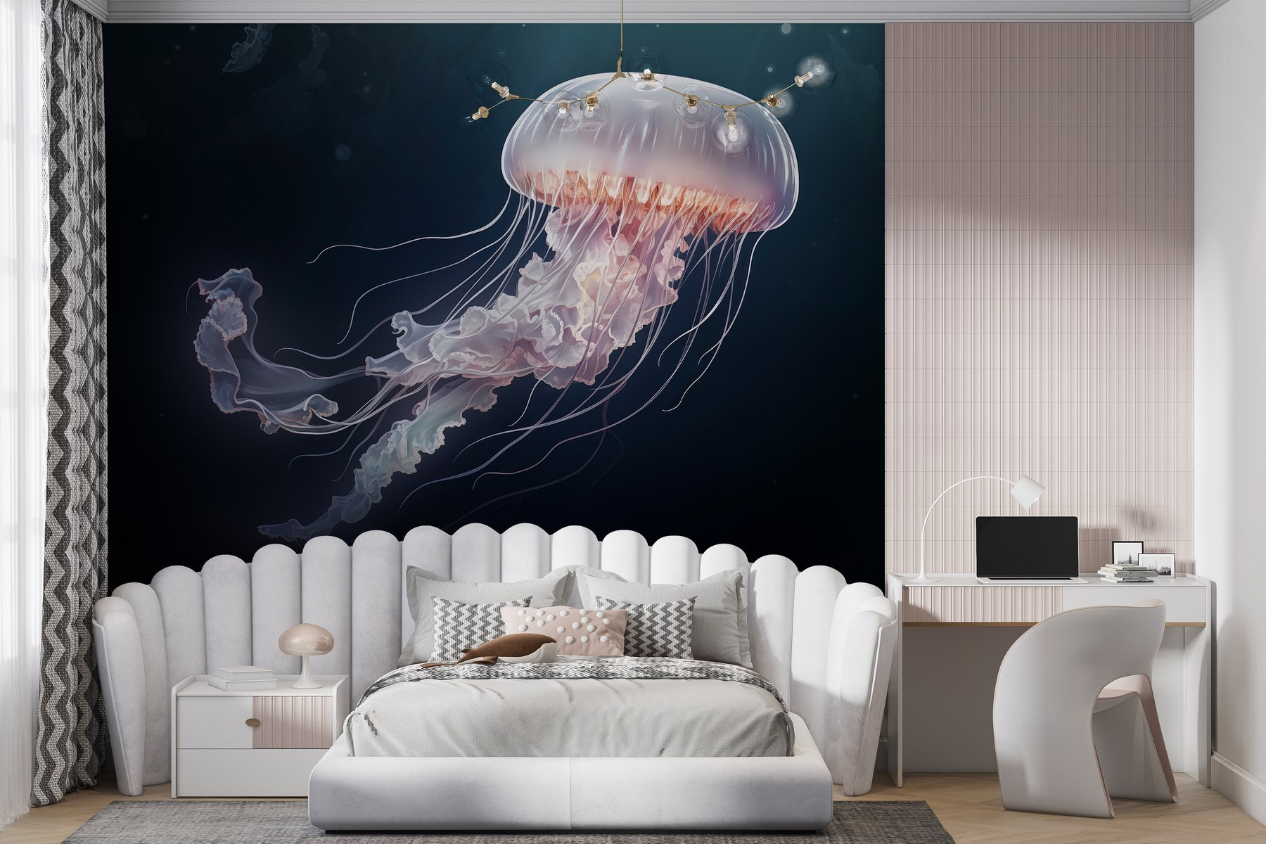 Immergetevi in un mare di tranquillità con questo splendido murale a forma di medusa. Immaginatevelo appeso in un angolo accogliente o nel vostro salotto, con un’atmosfera rilassante che ricorda le pigre giornate in spiaggia. I colori scorrono come le onde dell’oceano, catturando sottilmente quella sensazione di sogno sottomarino. Immaginate gli amici che si fermano, con gli occhi spalancati, davanti alla sua grazia delicata. Questo murale non si limita a decorare una parete, ma trasporta in un sereno mondo sottomarino. È come avere una fetta di oceano proprio a casa, perfetta per sognare a occhi aperti o per pianificare la prossima fuga al mare. Chi avrebbe mai immaginato che l’oceano potesse essere così bello?