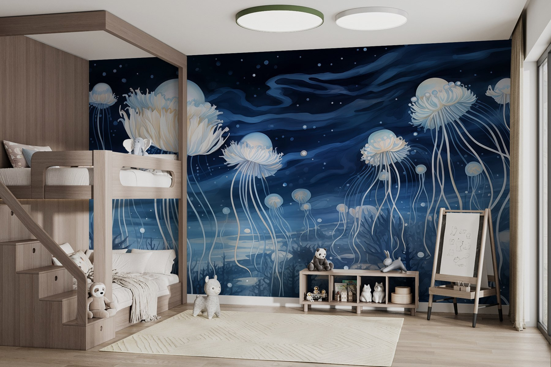 Trasformate qualsiasi spazio in un rilassante paesaggio subacqueo da sogno con questo murale mozzafiato di meduse che scivolano in una notte stellata. Immaginate questo: entrando nella stanza, vi sembrerà di galleggiare in un oceano di tranquillità, vero? I blu e i bianchi tenui delle meduse danzano con grazia, mentre il cielo notturno si riempie di piccole stelle, regalando un’atmosfera eterea. Perfetto per un salotto o per un accogliente angolo di lettura: potreste ritrovarvi a sognare ad occhi aperti, persi nei vostri pensieri. È anche un argomento di conversazione! Gli amici potrebbero chiedervi se avete nuotato con le meduse. Immaginate la loro sorpresa quando risponderete di no, che invece siete stati a casa vostra!