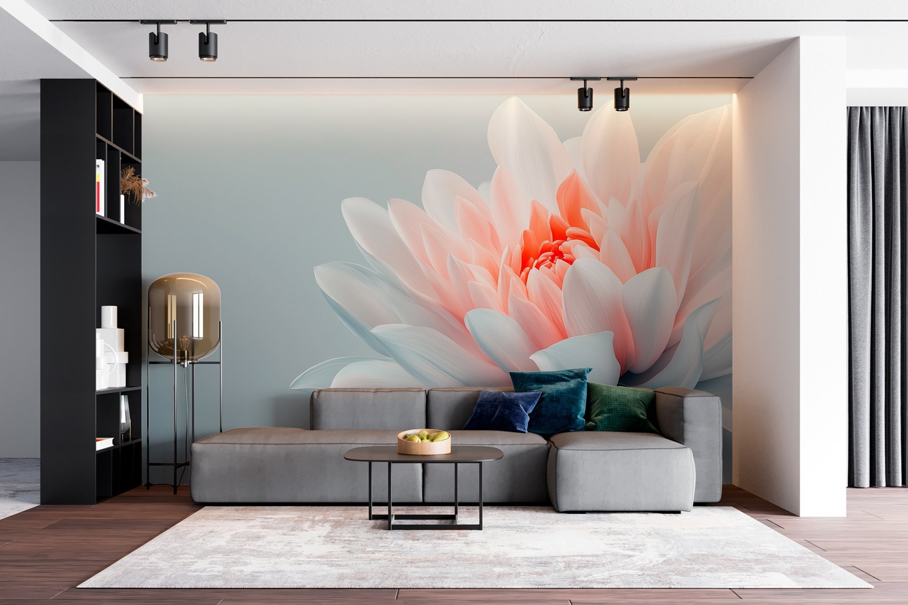 Guardate esattamente come apparirà il vostro spazio con la nuova carta da parati prima di acquistarla. Visualizzazione professionale da parte di designer esperti senza alcun costo o obbligo di acquisto.