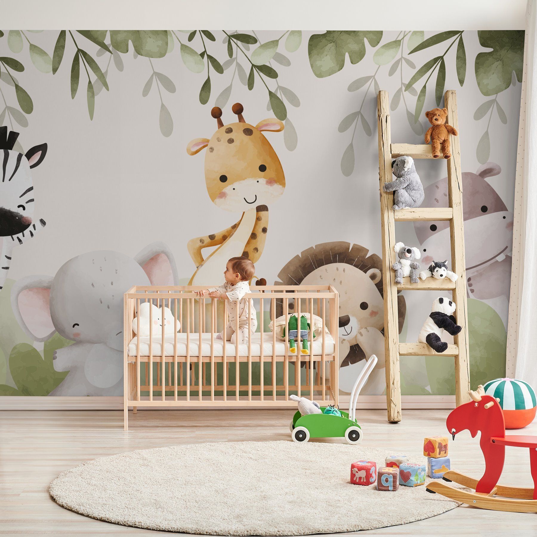 Rallegrate qualsiasi stanza con questo delizioso murale che raffigura una giocosa sfilata di adorabili animali, adagiati sotto chiome frondose. Immaginate una giraffa curiosa che si mette in posa, mentre un elefante allegro si mette a ballare: che dolcezza! Questa scena stravagante trasmette calore e giocosità, perfetta per la stanza dei bambini o per un accogliente angolo di lettura. Ogni personaggio sembra avere una propria storia, che stimola la creatività e il sorriso. I colori delicati e le espressioni amichevoli invitano a un senso di calma, trasformando qualsiasi spazio in un mini rifugio nella giungla. Fidatevi, vi ritroverete a sorridere ogni volta che passerete di lì!