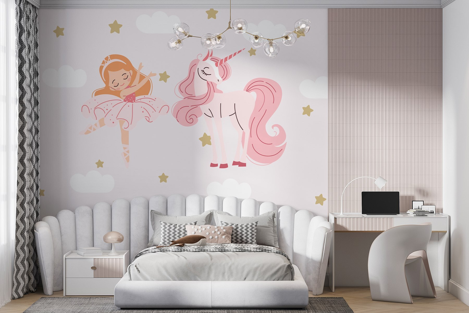 Trasformate lo spazio di ogni bambino in un regno magico con questo delizioso murale che raffigura una ballerina di danza classica e un affascinante unicorno. Immaginatevi i bambini che volteggiano per la stanza, immaginando di partecipare a un grande spettacolo mentre il loro nuovo amico unicorno fa la guardia. I colori tenui e pastello e le nuvole stravaganti aggiungono un tocco sognante, facendo sembrare un’avventura anche il momento del pisolino. Immaginate le risate e gli occhi spalancati dei bambini che raccontano la loro esibizione di danza con gli unicorni. Non è solo un murale: è l’inizio di innumerevoli viaggi immaginativi. Chi non vorrebbe questo tipo di magia sulle proprie pareti?
